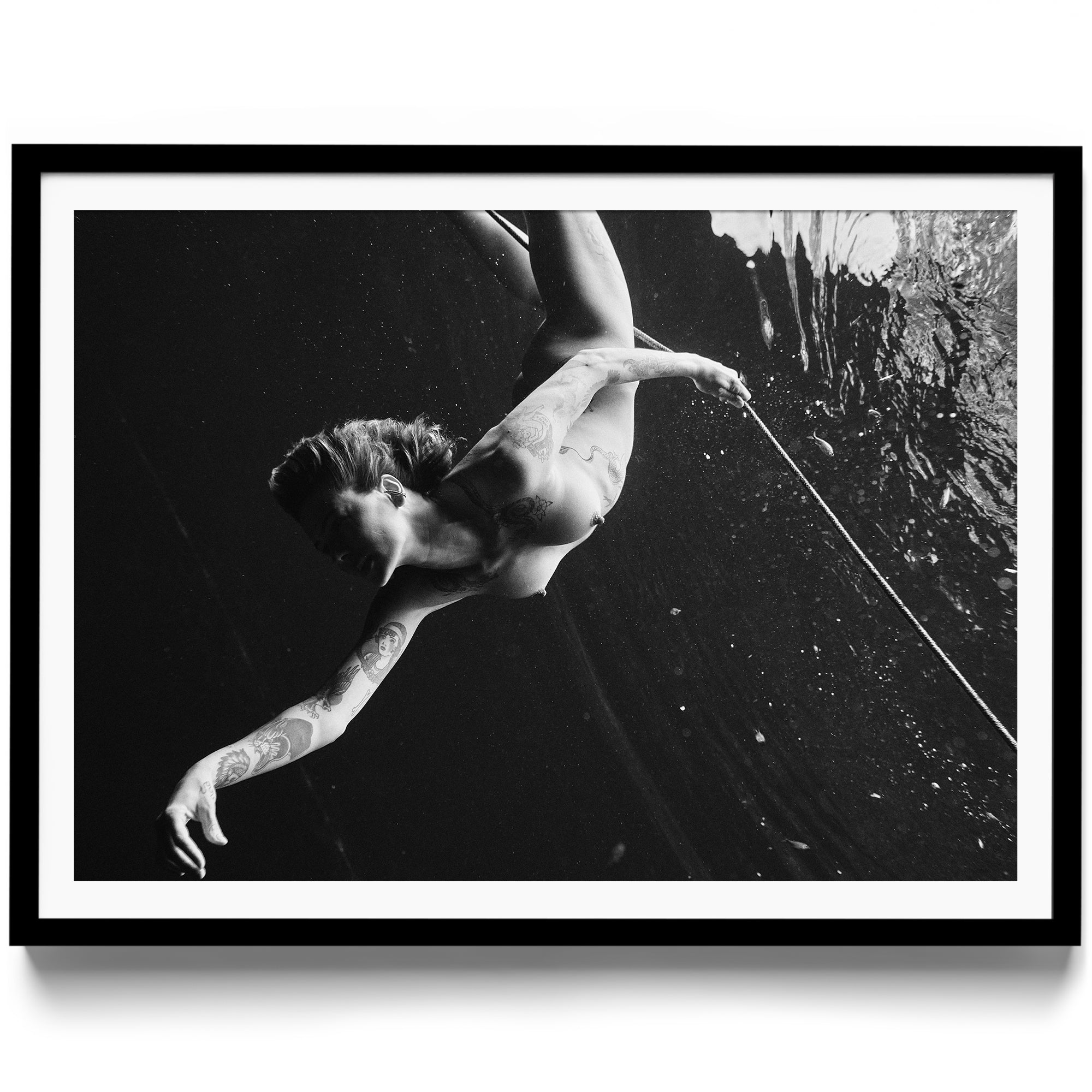 This piece freezes a moment of pure athletic artistry, where human movement and natural elements combine to create a powerful visual story. The black and white treatment elevates the dramatic quality, while the streaming light creates natural spotlights on the performance unfolding in the depths.