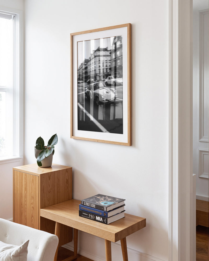 This piece captures the essence of vintage motorsport culture while creating a sophisticated artistic statement. The motion blur and architectural backdrop combine to tell a story of speed, luxury, and timeless style that transforms any space into a gallery of automotive art.