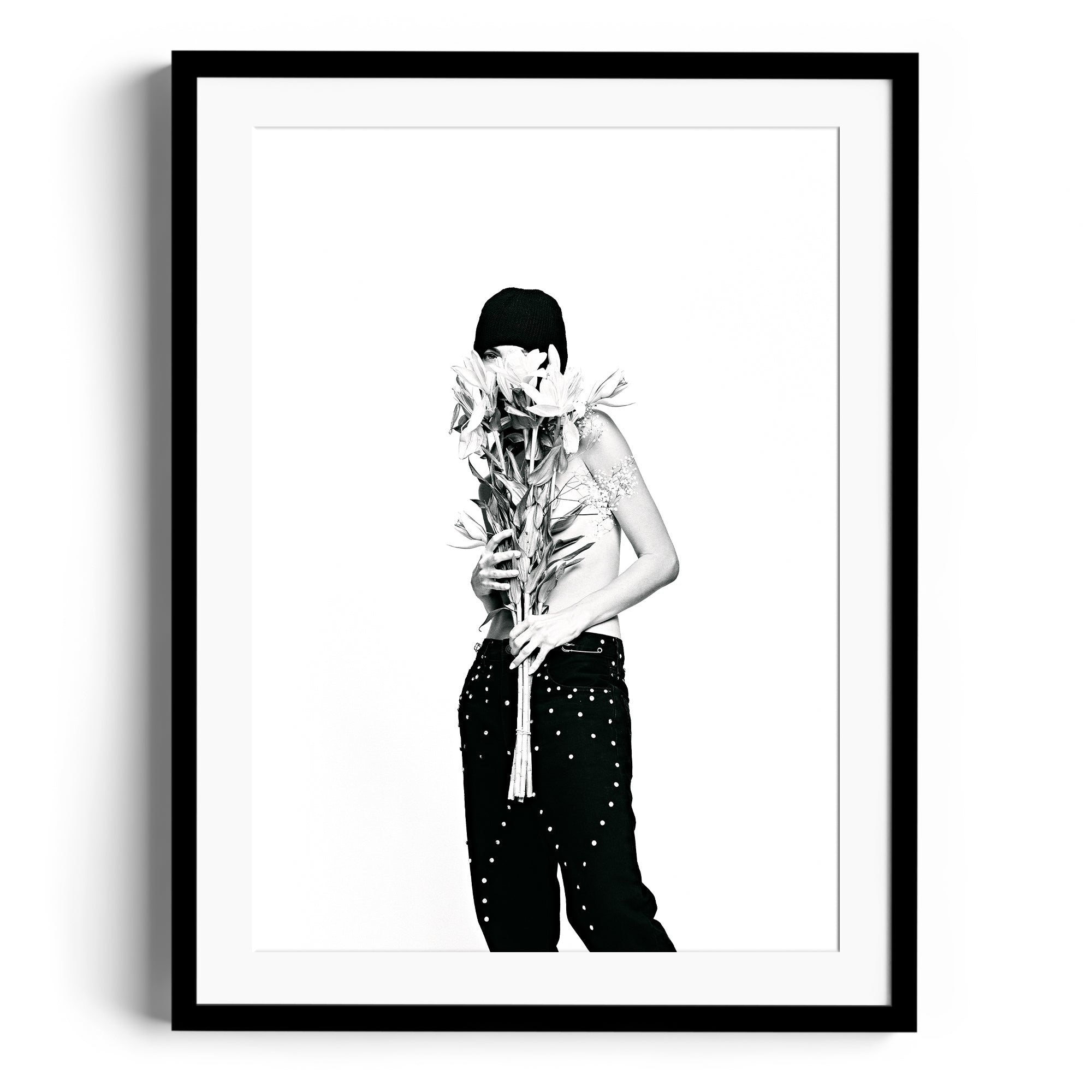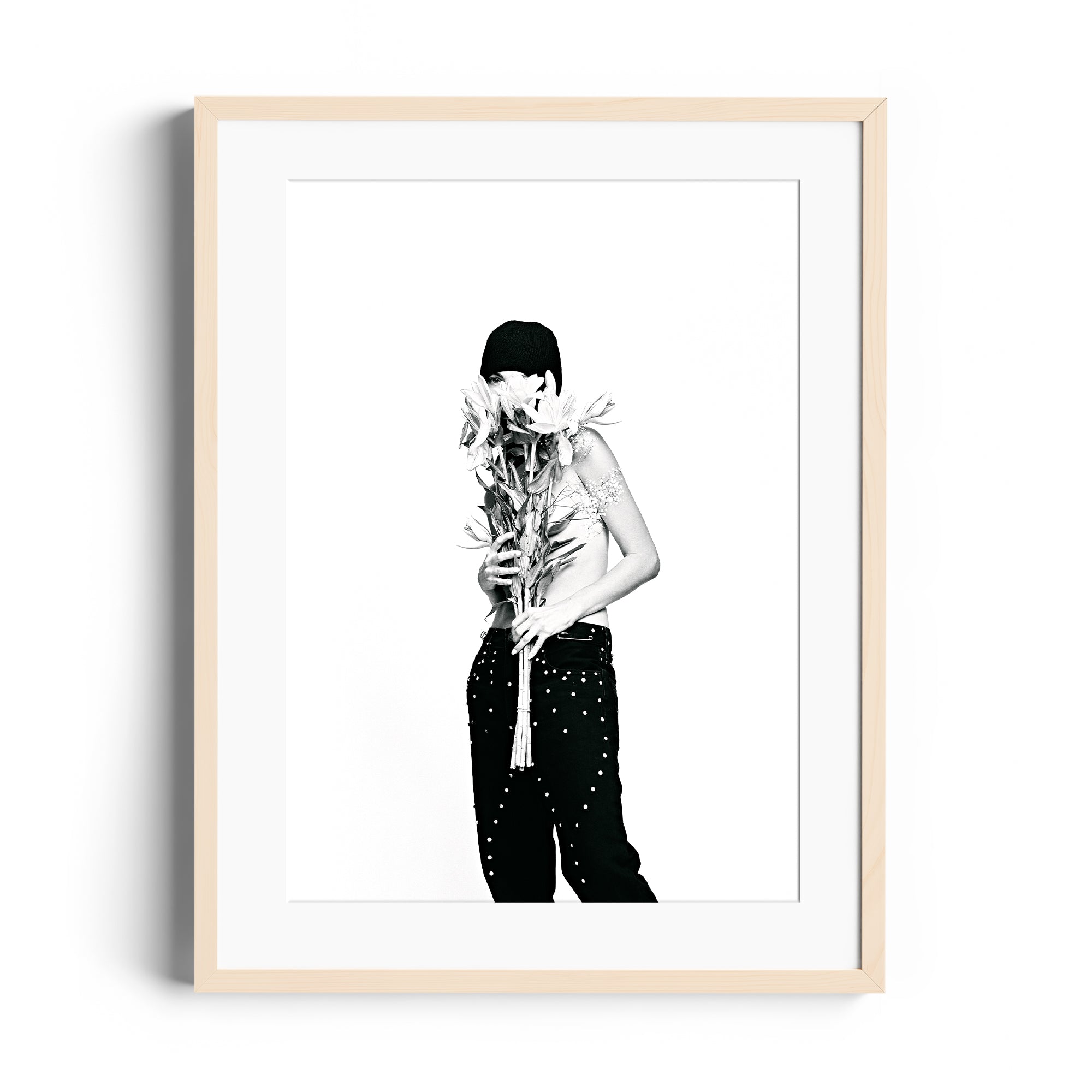 "Golden Edge" portrays a quiet moment of introspection, where light and shadow intersect with minimalist beauty. The delicate balance of the subject's pose and the vibrant bouquet evokes a sense of strength wrapped in subtlety, making this piece an ode to refined individuality.
