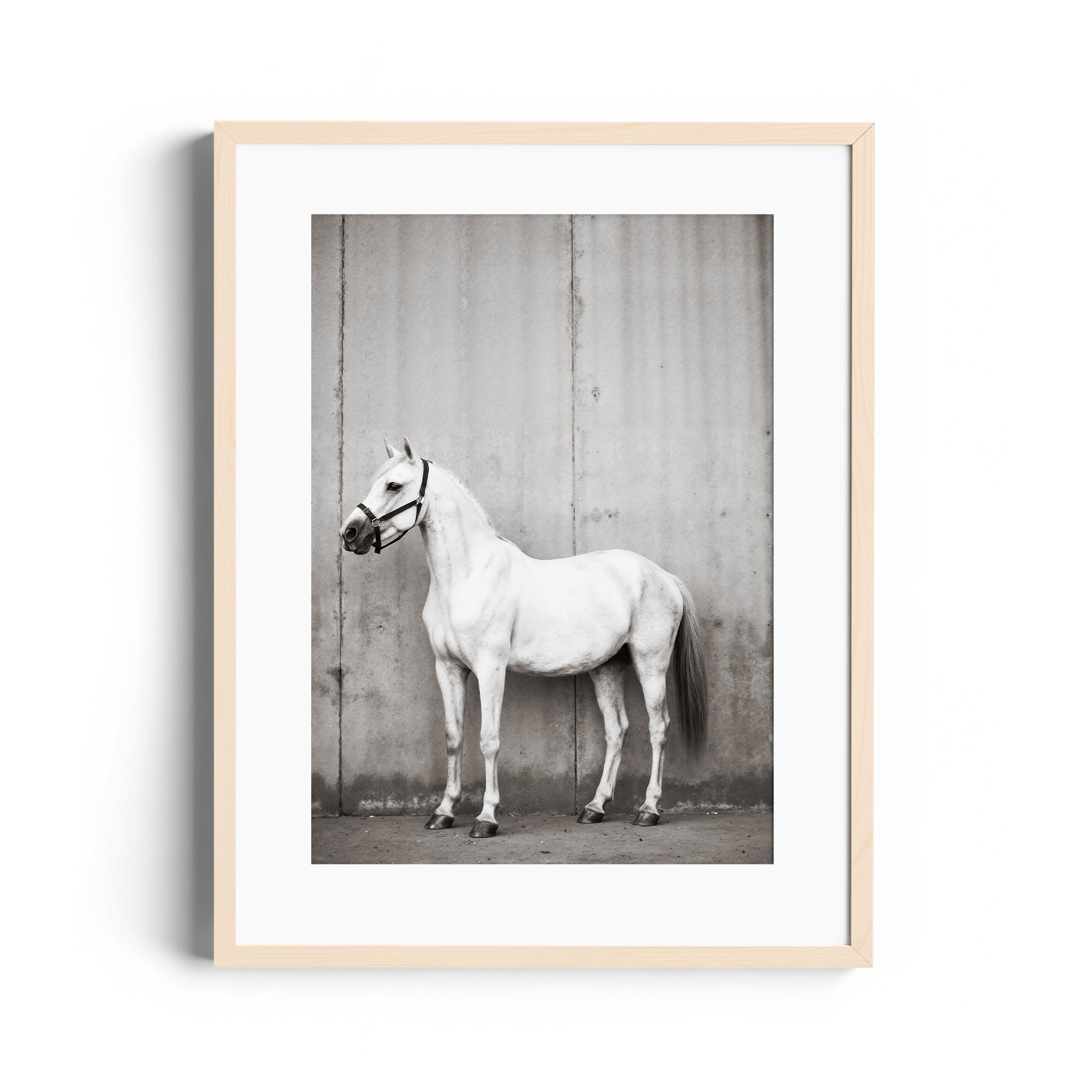 Through meticulous attention to detail and lighting control, the rich black leather of the saddle gains a sculptural presence over the horse's textured coat, enhancing its dramatic form.