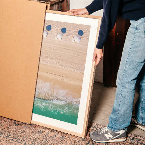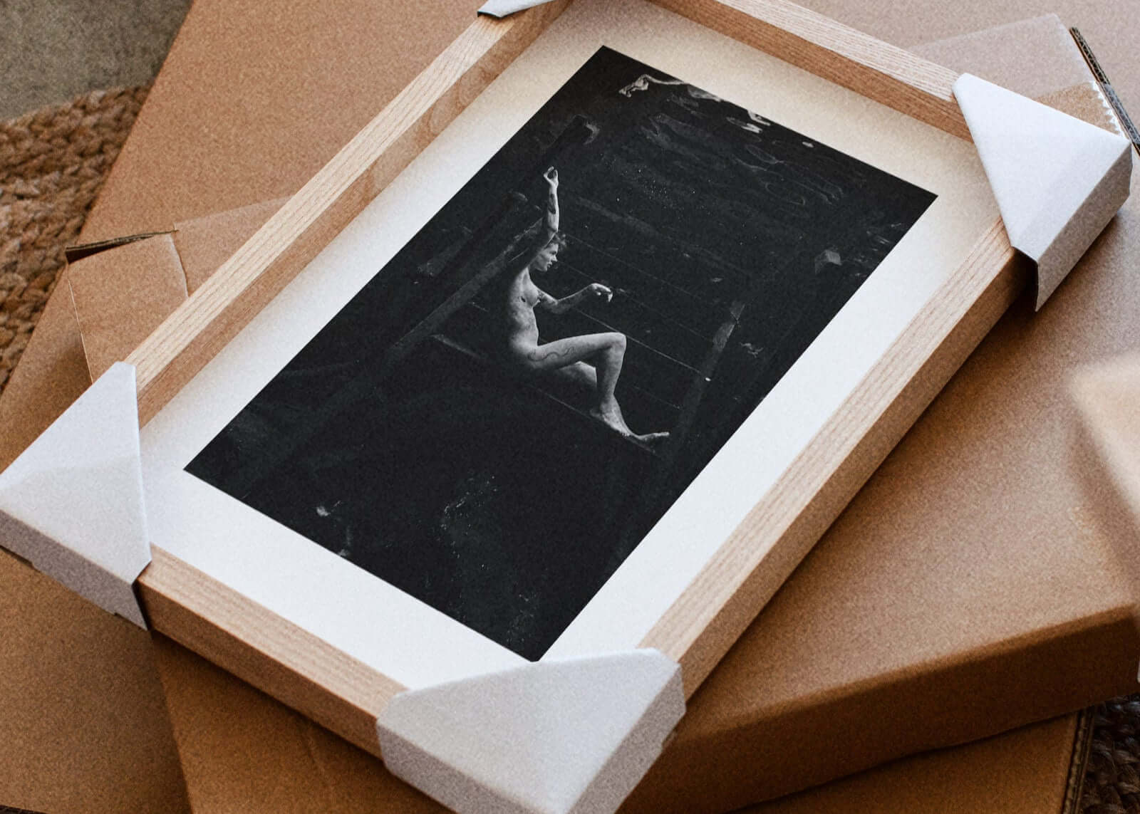 Your artwork arrives in specialized protective packaging designed specifically for fine art transportation. Each framed piece is secured with corner protectors and wrapped in a protective polymer layer that guards against moisture and scratches during transit.