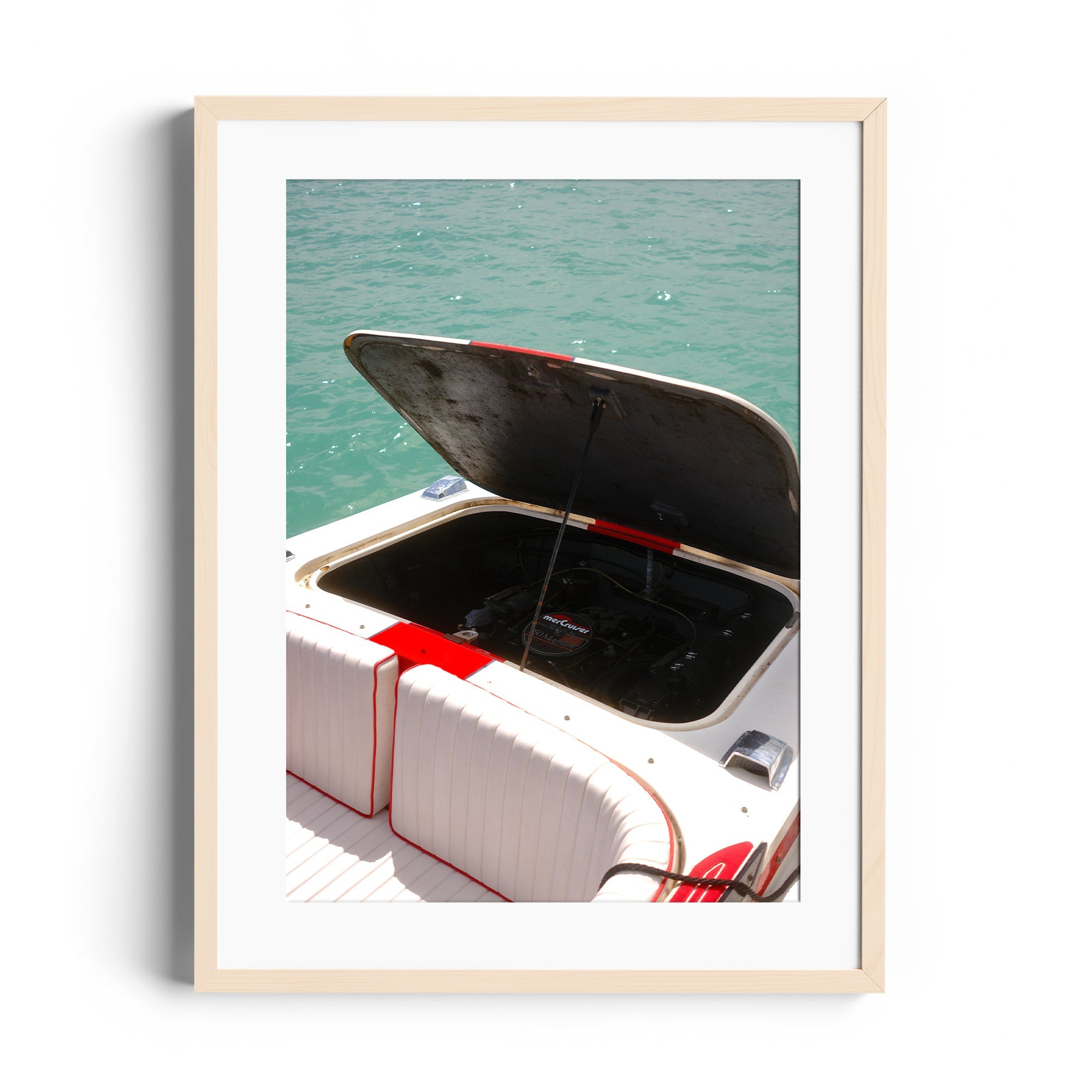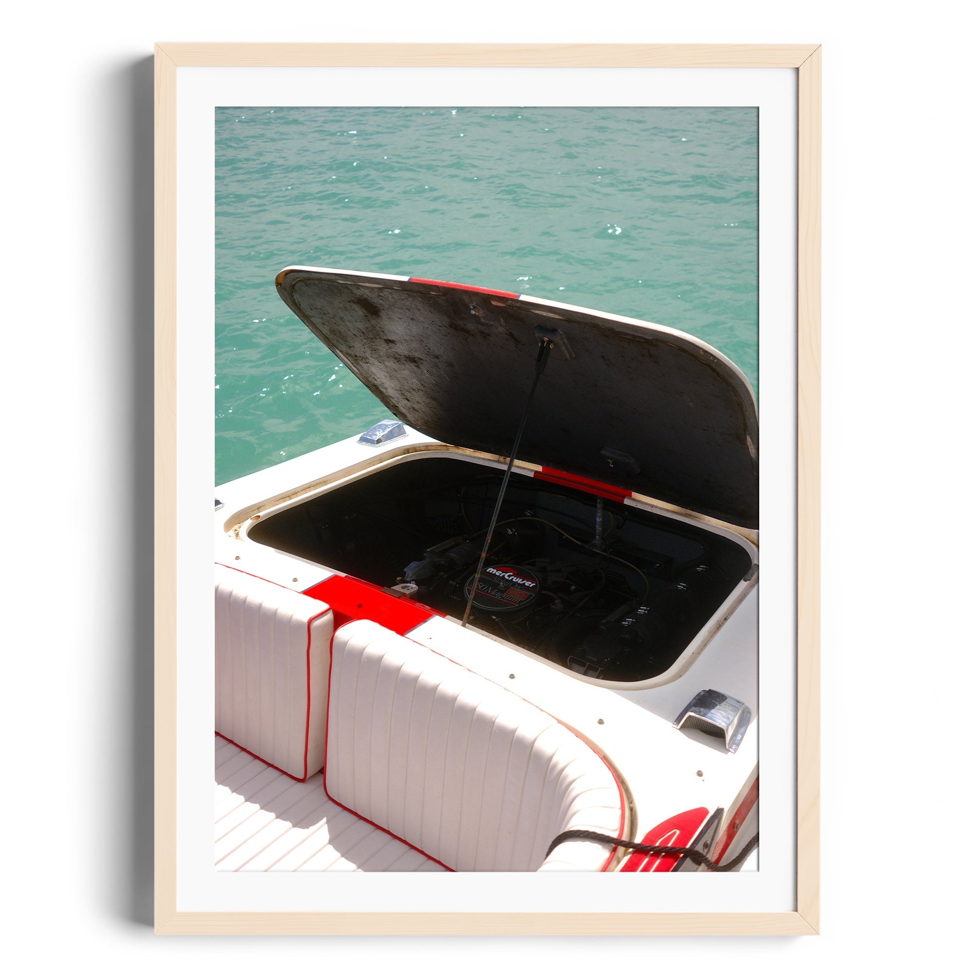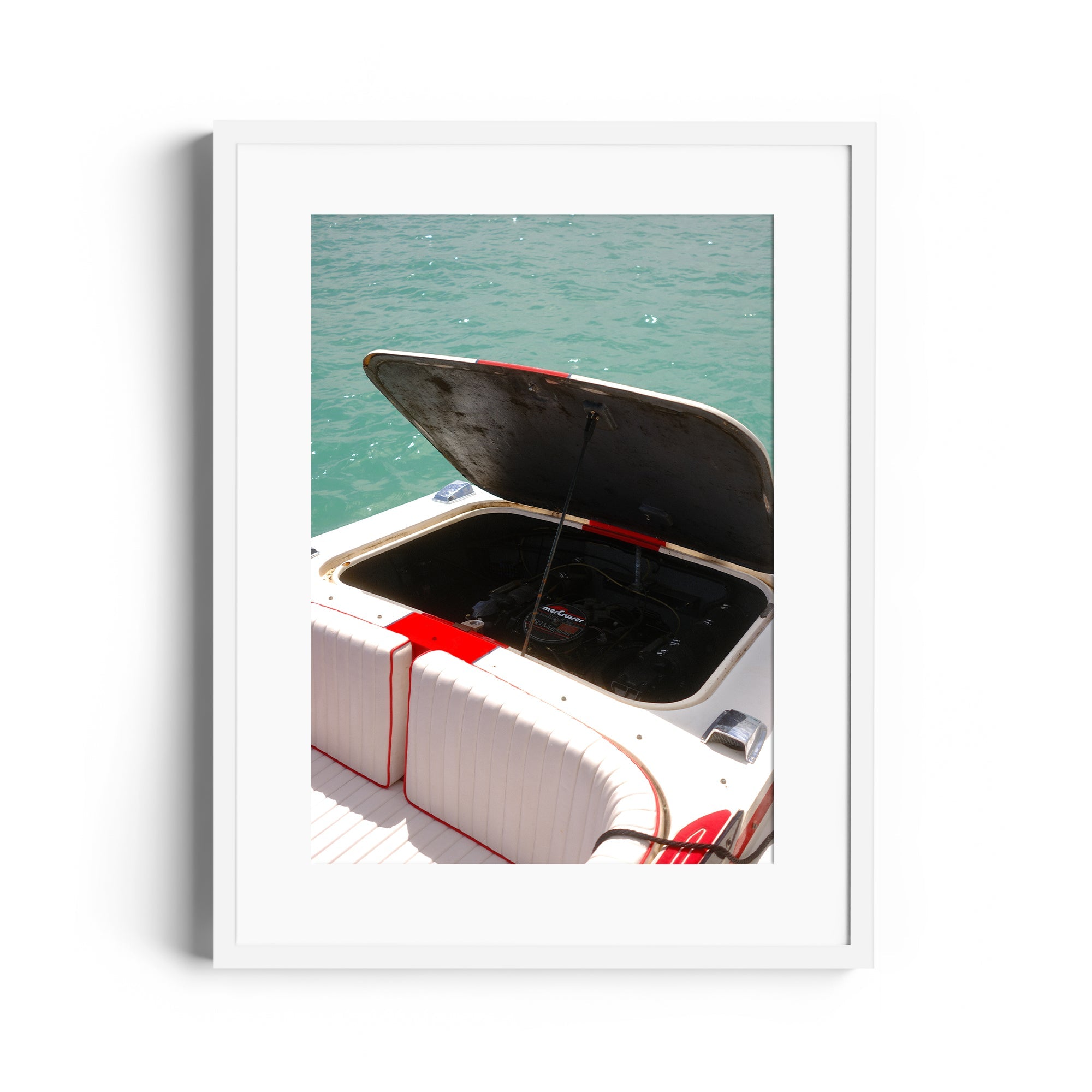 This framed photograph captures the engine compartment of a vintage speedboat against luminous turquoise waters. The composition reveals an open hatch displaying a MerCruiser engine, contrasting with the boat's pristine white exterior and distinctive red accenting. The elegant white upholstery with red piping echoes the nautical aesthetic established in the previous image, continuing Diego Cadavid's exploration of classic boat design. This piece appears to be part of the same "1987" series, where Cadavid examines the intersection of functional machinery and aesthetic design in vintage watercraft. The photograph's careful framing and presentation in a minimalist white frame elevates what might be considered a utilitarian detail into a contemplative study of form, color, and maritime craftsmanship—characteristic of Cadavid's approach to transforming everyday subjects into striking fine art compositions.