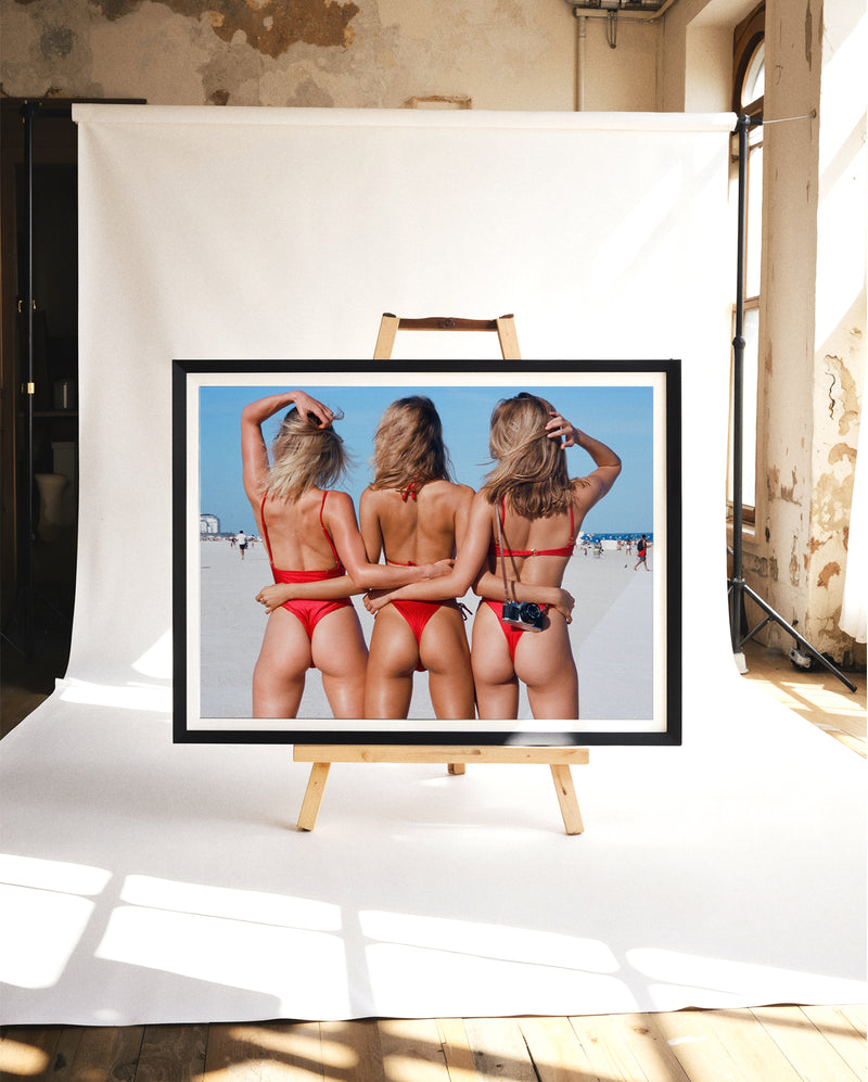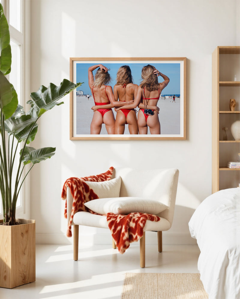 The Artwork: This isn't just a photograph – it's a time machine to Miami's most stylish era. The composition brilliantly captures three figures in cherry-red swimwear, their silhouettes perfectly balanced against the azure infinity of a Miami Beach sky. The positioning speaks volumes: confidence, camaraderie, and that ineffable cool that defined a golden age of beach culture.