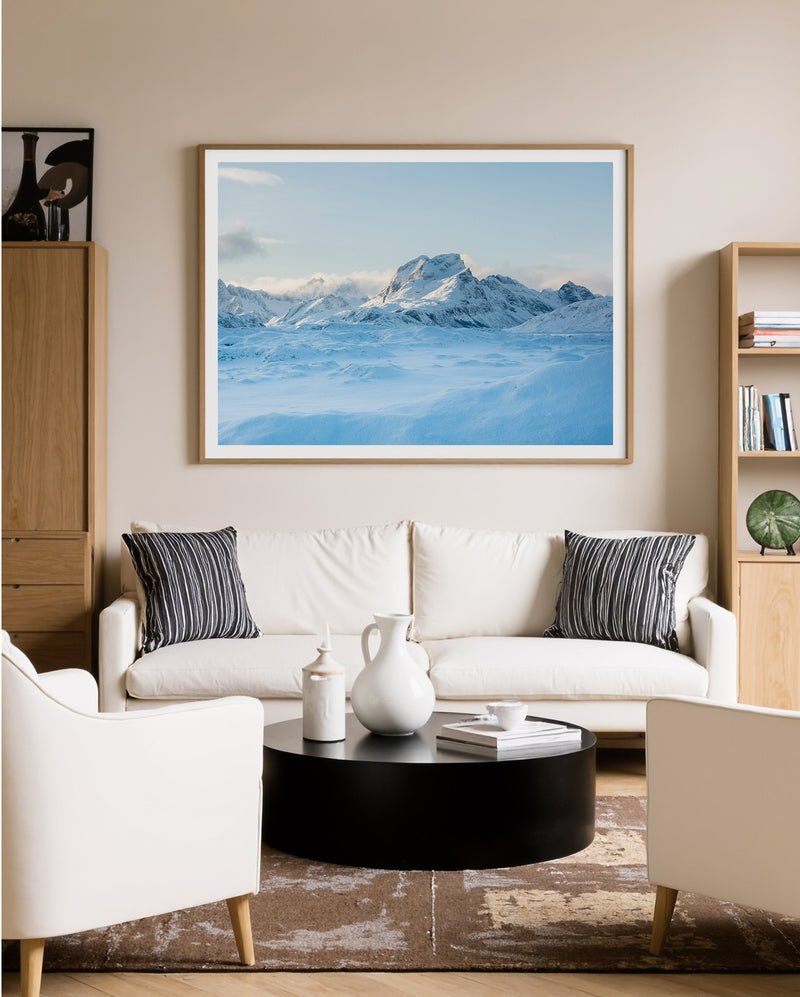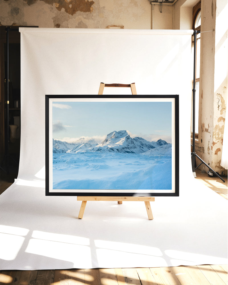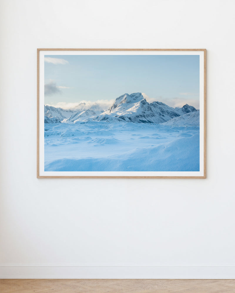 Experience the serene elegance of Norway’s Lofoten archipelago with "BLANC," a distinguished piece from George Lozada's exclusive "Norwegian Soul" collection. This captivating photograph encapsulates the tranquil beauty of a snow-covered landscape, where nature's subtle artistry meets minimalist sophistication.