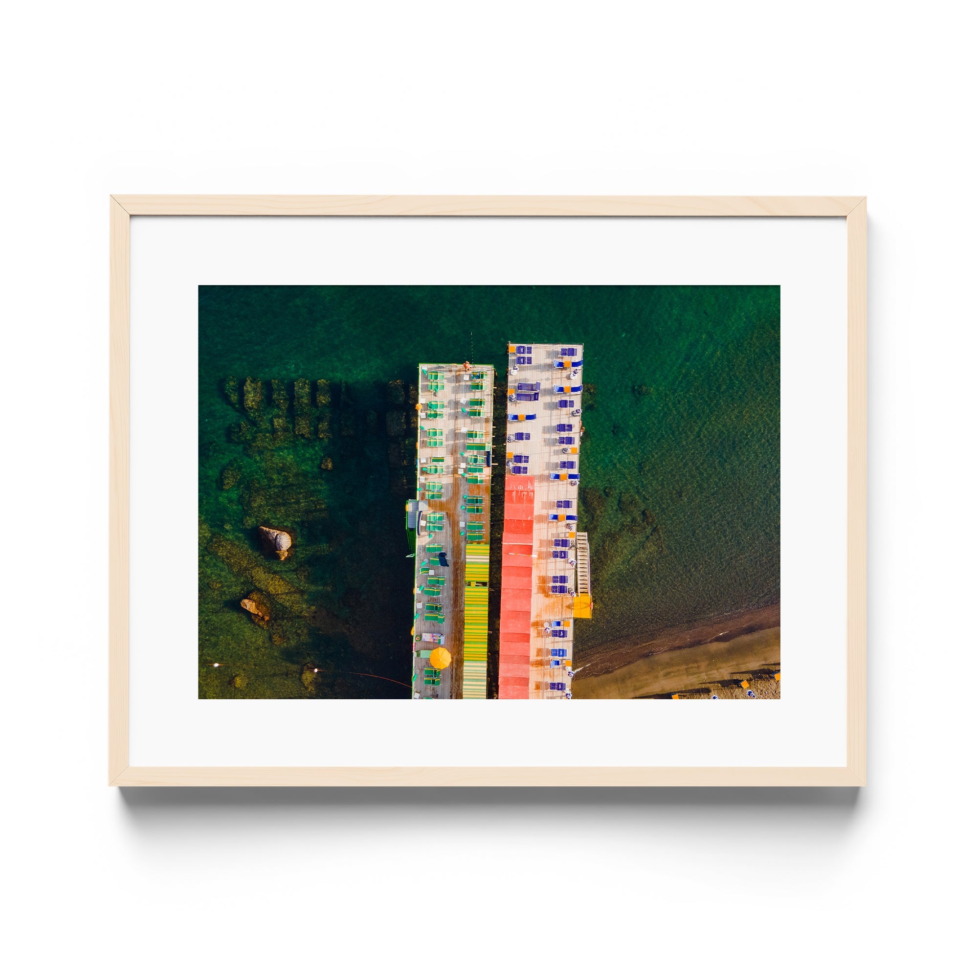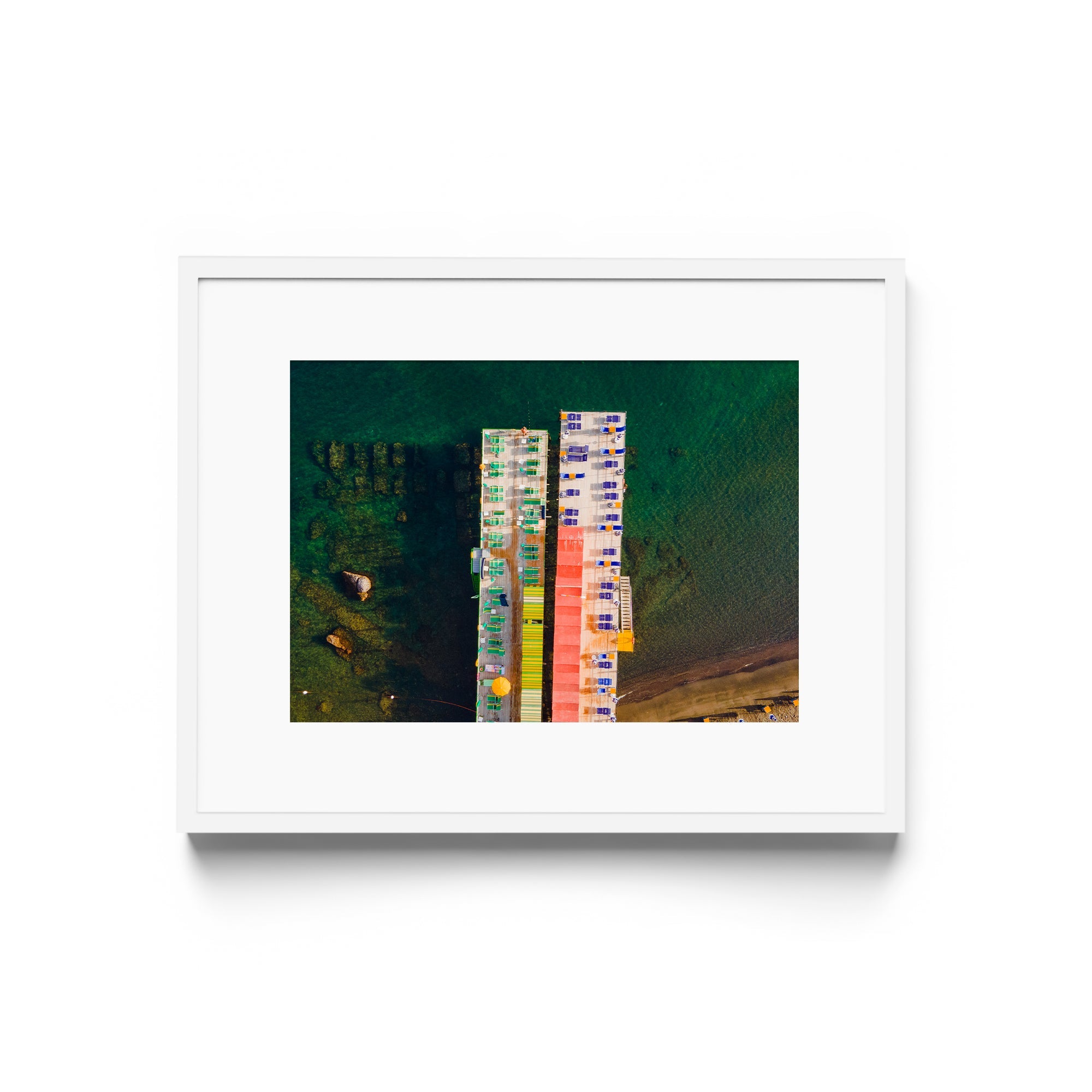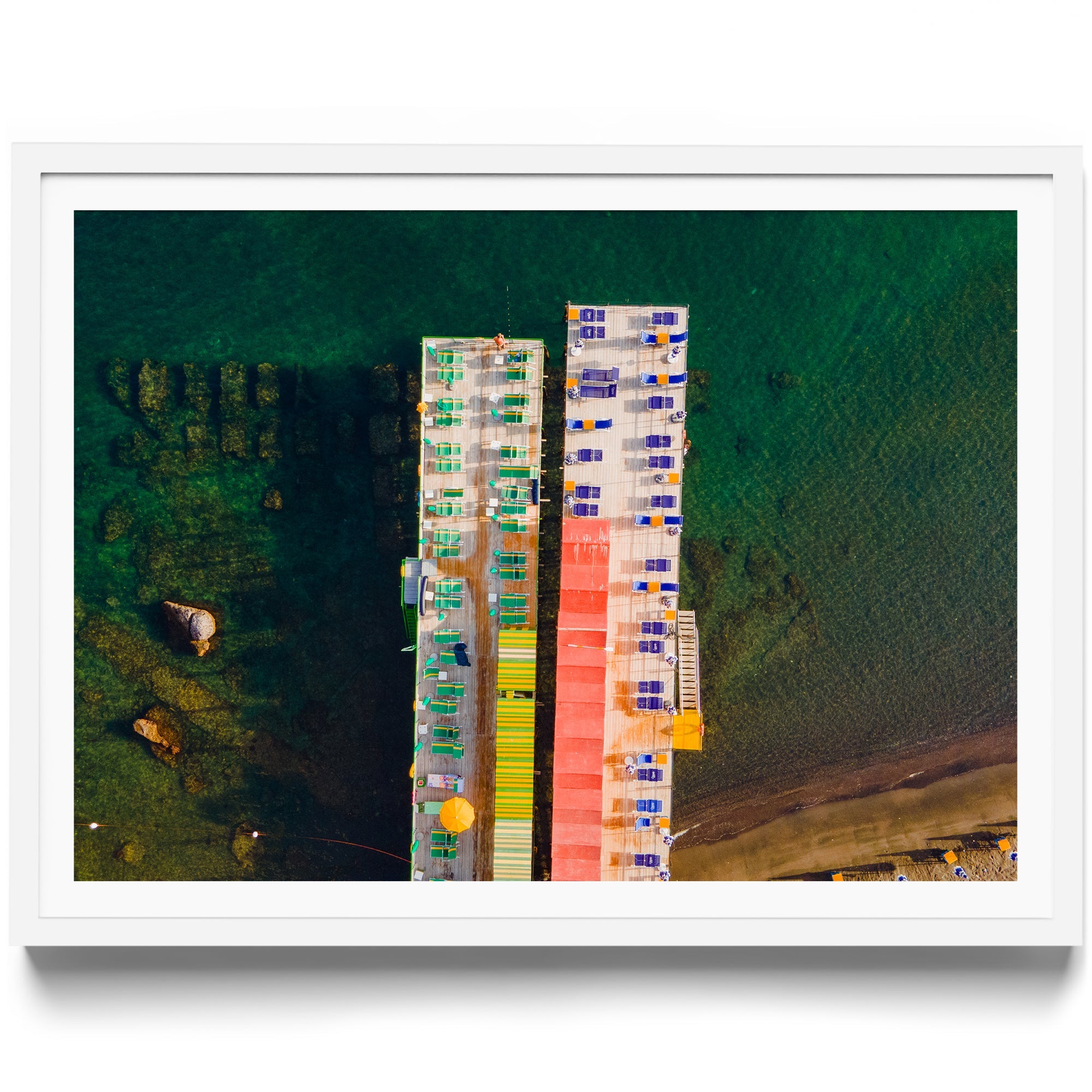 In this striking aerial view of Sorrento’s harbor, George Lozada imbues an Italianate elegance with a playful twist on color and form. The shimmering green sea sets the stage for rows of green, blue, and red chairs—arranged in such a way that they resemble the windows of a towering structure—while the harbor’s two piers stand like parallel buildings rising from the water. Through this clever composition, Lozada elevates a simple coastal scene into a vibrant tapestry of geometry, color, and Mediterranean charm.