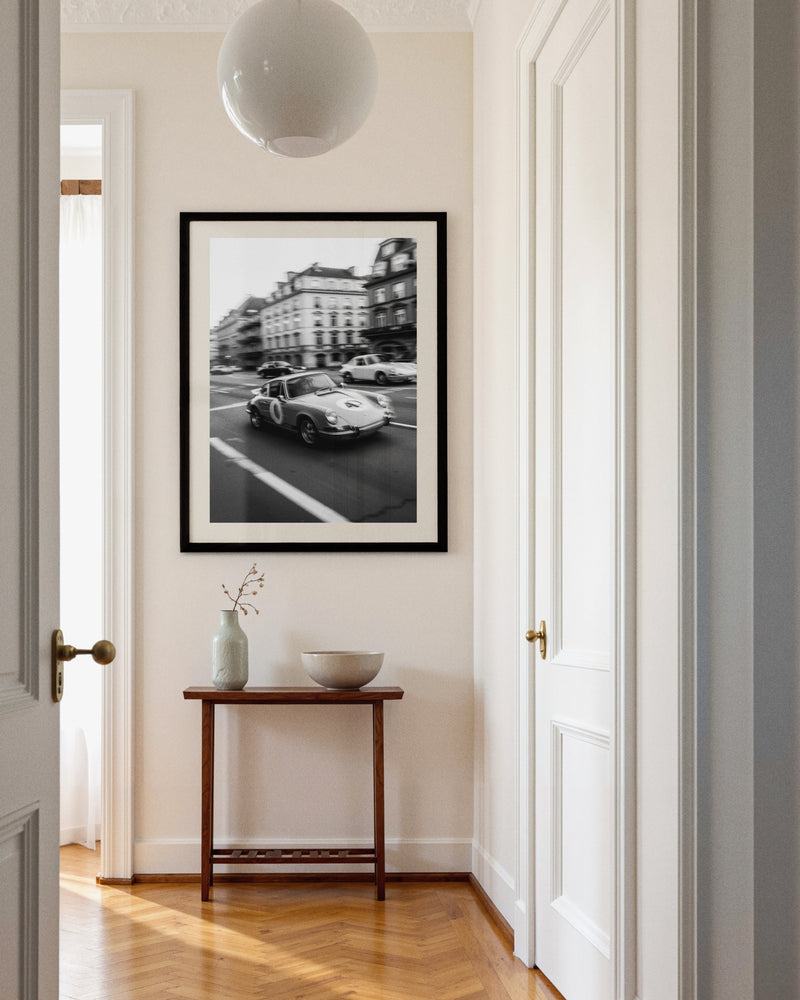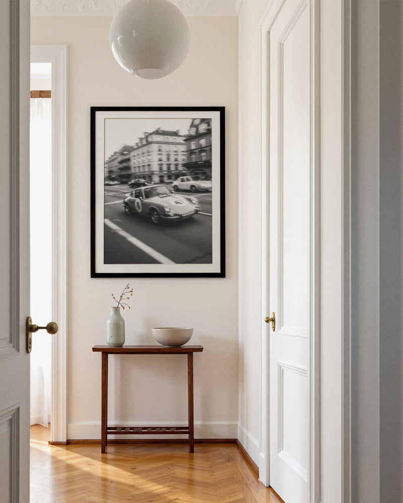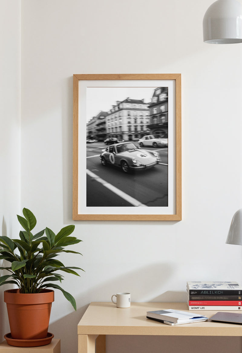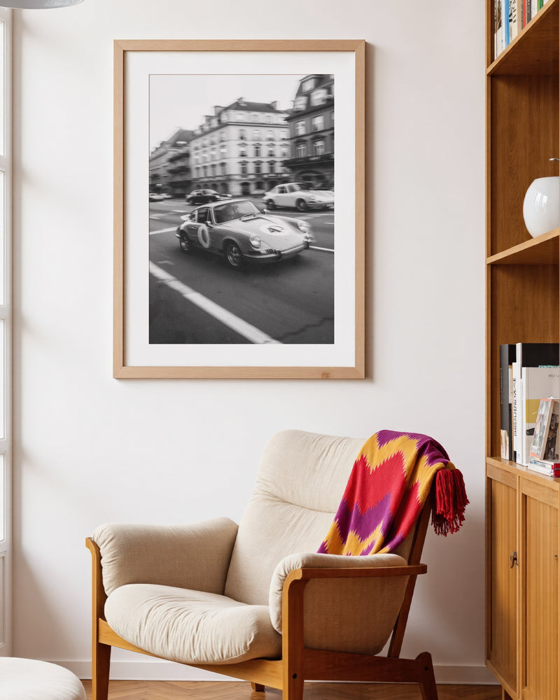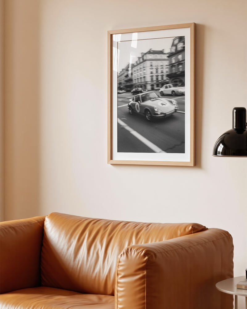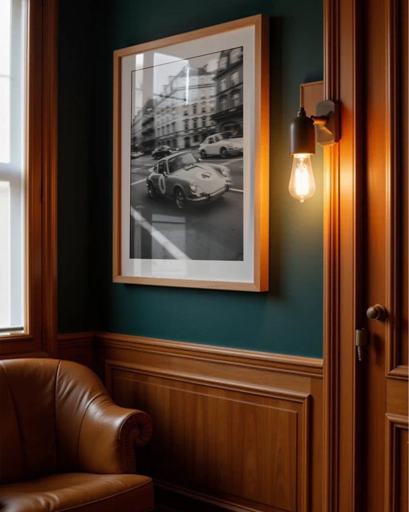 This piece captures the essence of vintage motorsport culture while creating a sophisticated artistic statement. The motion blur and architectural backdrop combine to tell a story of speed, luxury, and timeless style that transforms any space into a gallery of automotive art.