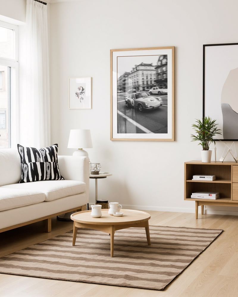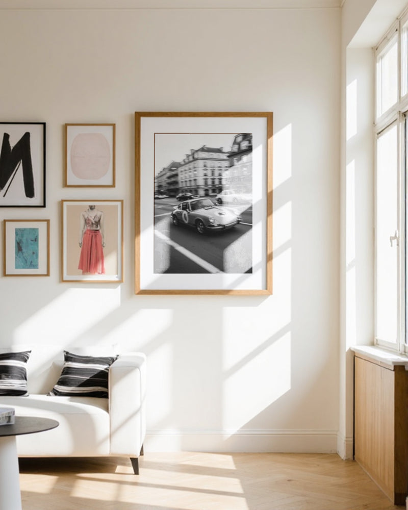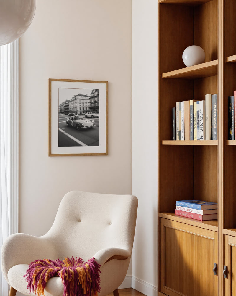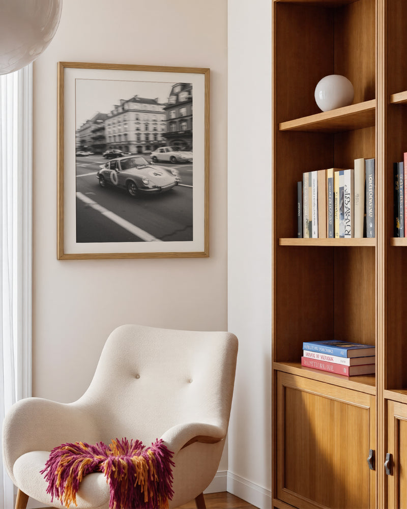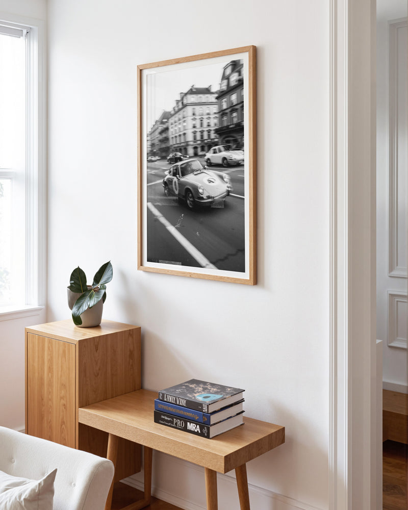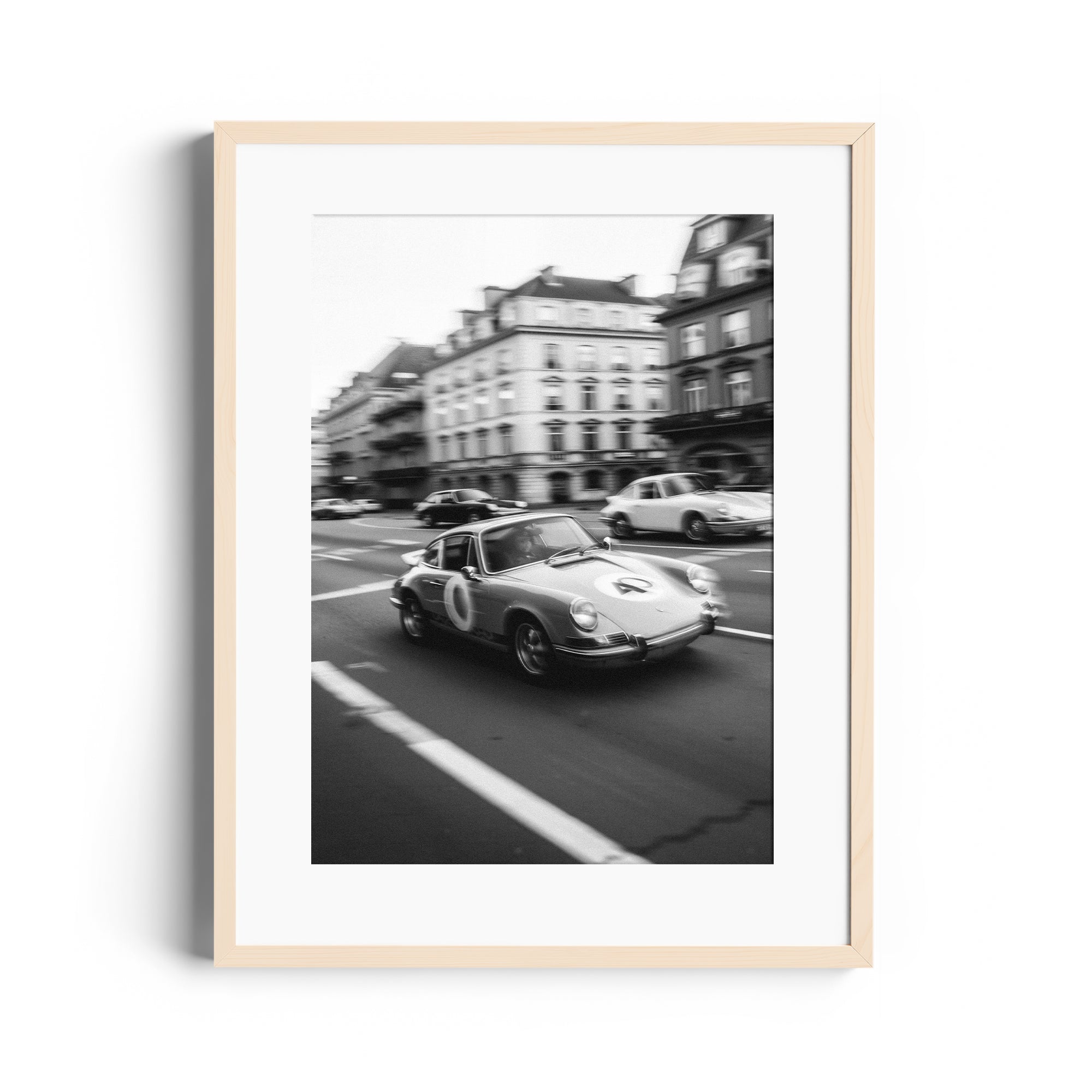 This piece captures the essence of vintage motorsport culture while creating a sophisticated artistic statement. The motion blur and architectural backdrop combine to tell a story of speed, luxury, and timeless style that transforms any space into a gallery of automotive art.