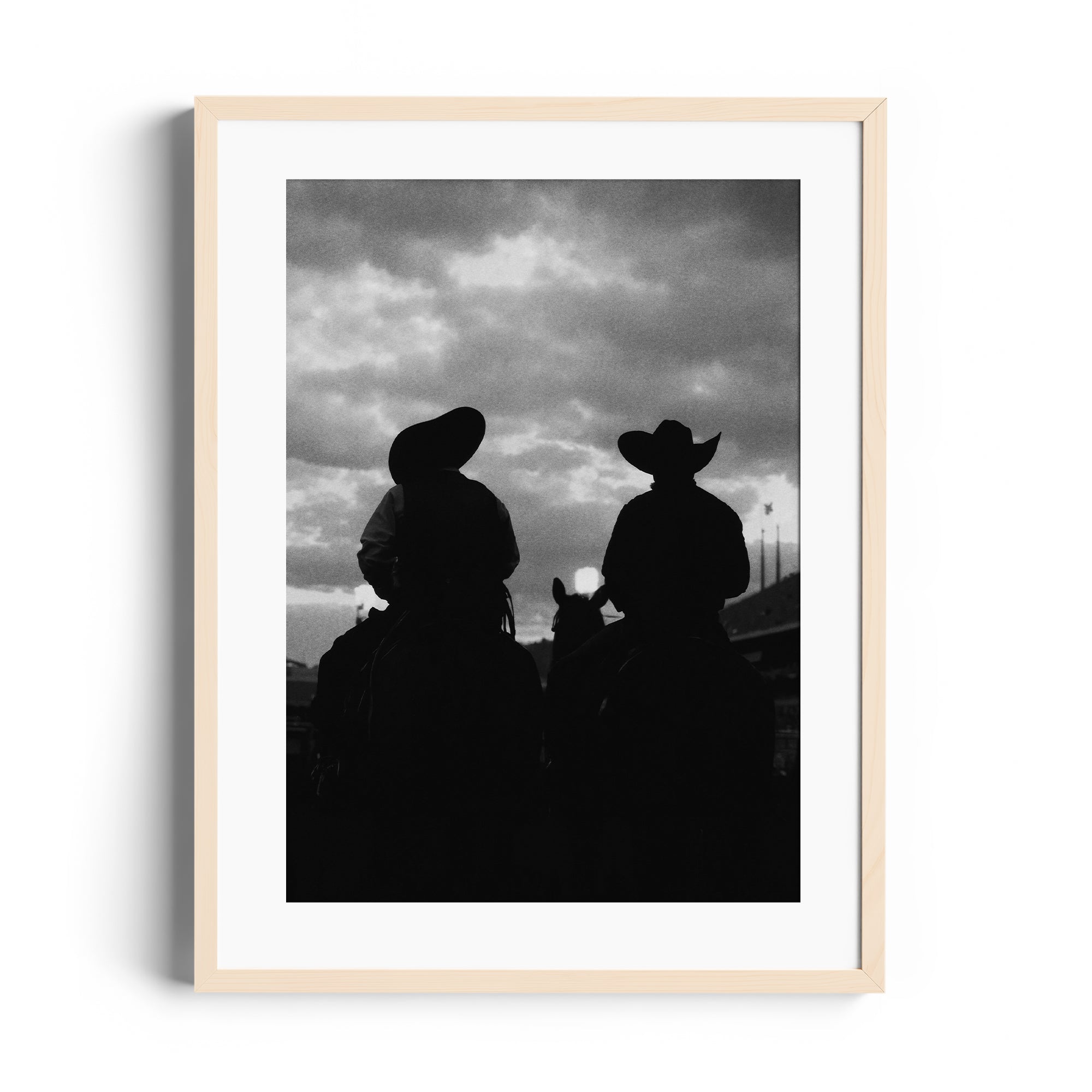 Through careful timing and contrast, Cadavid transforms an urban moment into a powerful artistic statement. The monochromatic treatment creates deep silhouettes that emphasize the timeless nature of these riders, while the city setting tells a story of tradition persisting in modern spaces. The composition speaks to how Western culture continues to thrive, even as it weaves through contemporary landscapes.