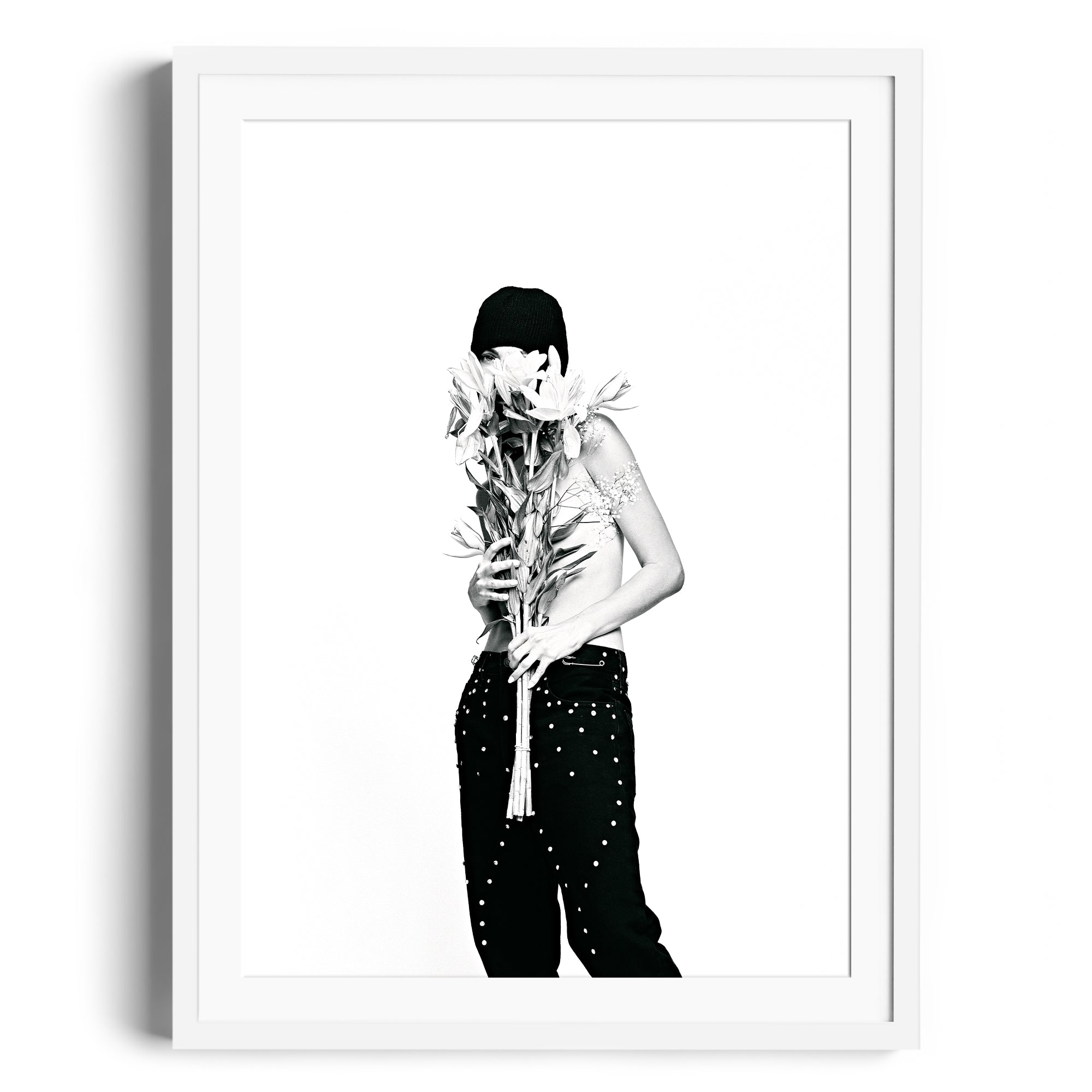 "Golden Edge" portrays a quiet moment of introspection, where light and shadow intersect with minimalist beauty. The delicate balance of the subject's pose and the vibrant bouquet evokes a sense of strength wrapped in subtlety, making this piece an ode to refined individuality.