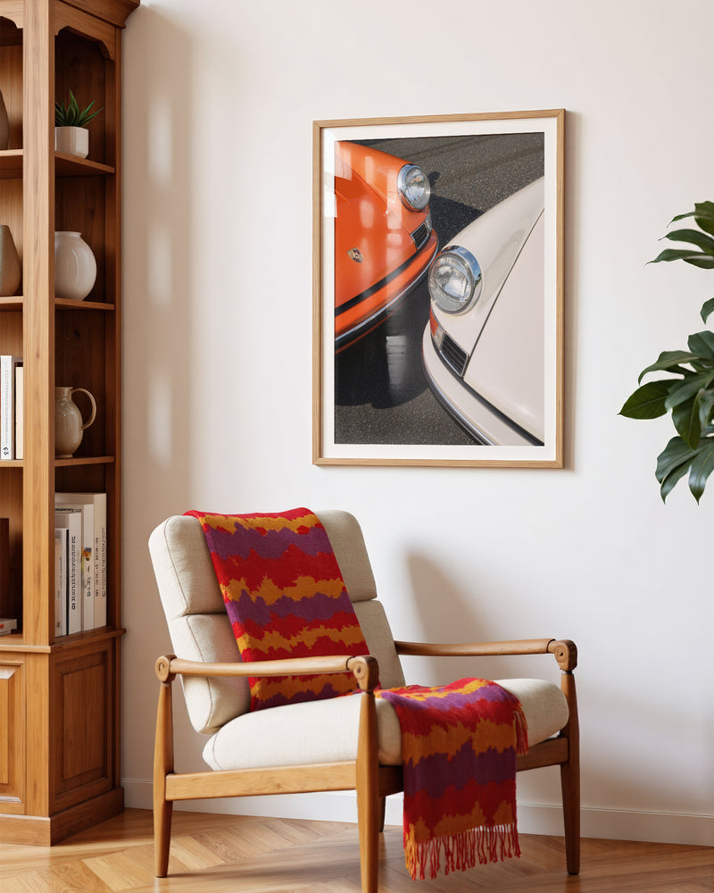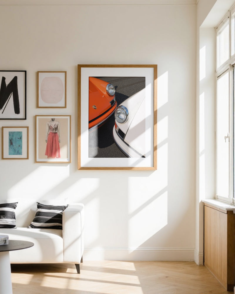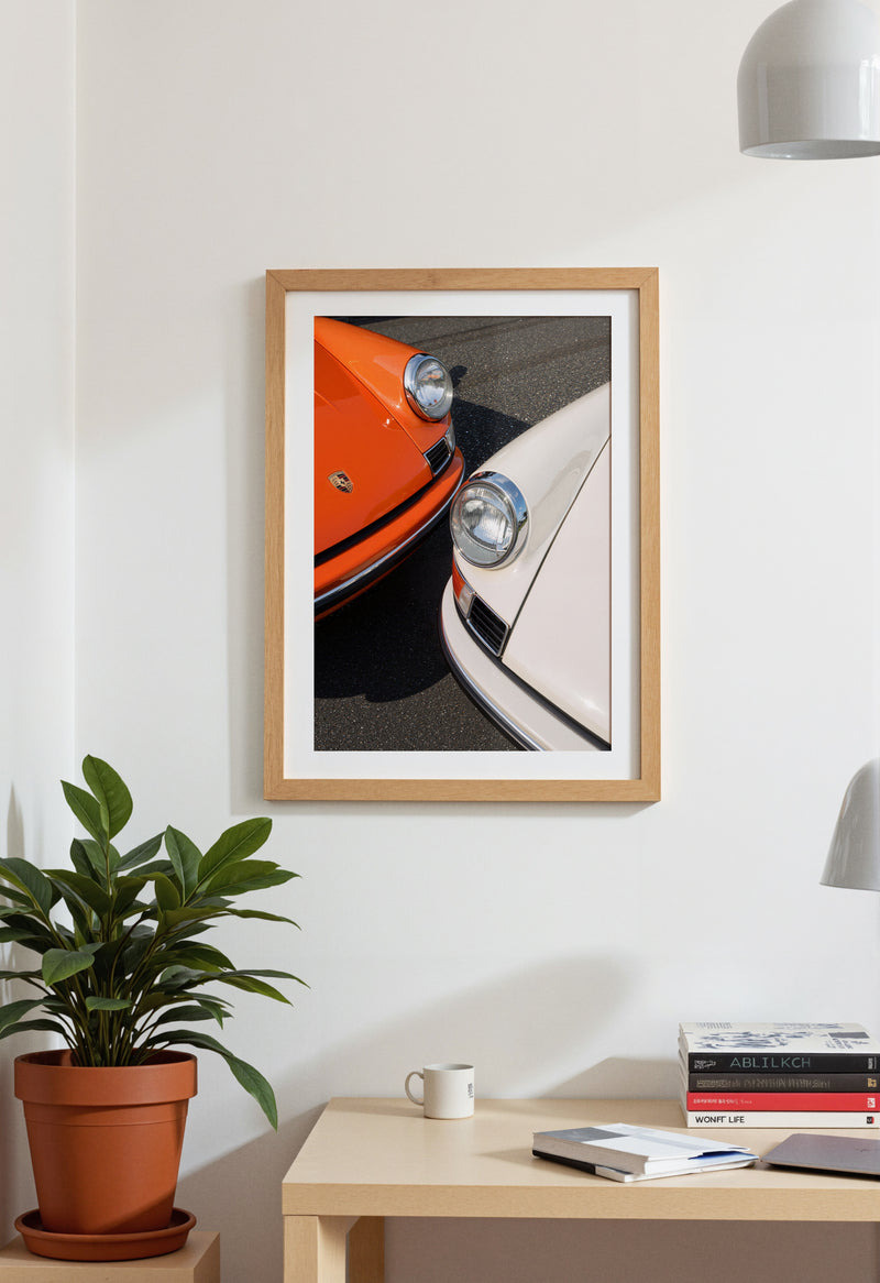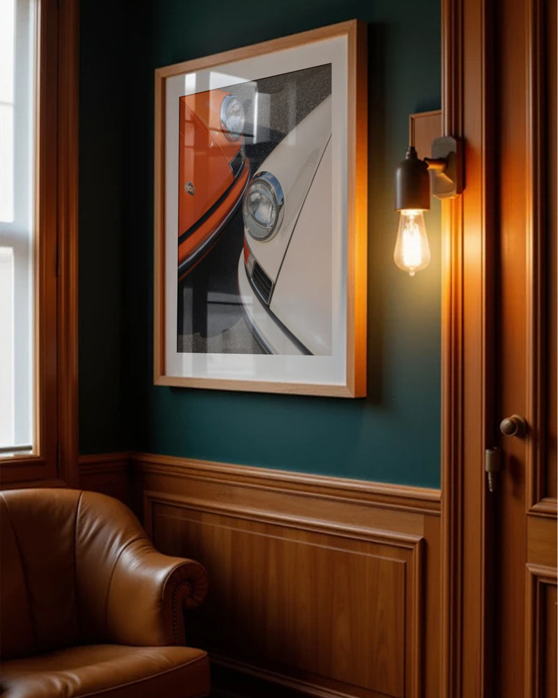 A masterful duet of automotive icons: two 1963 Porsche 911s captured in perfect symmetry. The interplay of orange and white creates a striking visual harmony, while the distinctive headlights and classic lines showcase the timeless design that revolutionized automotive history. This piece celebrates the birth year of a legend through a contemporary artistic lens.