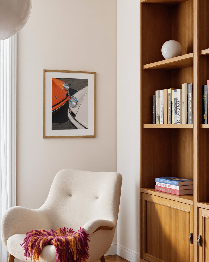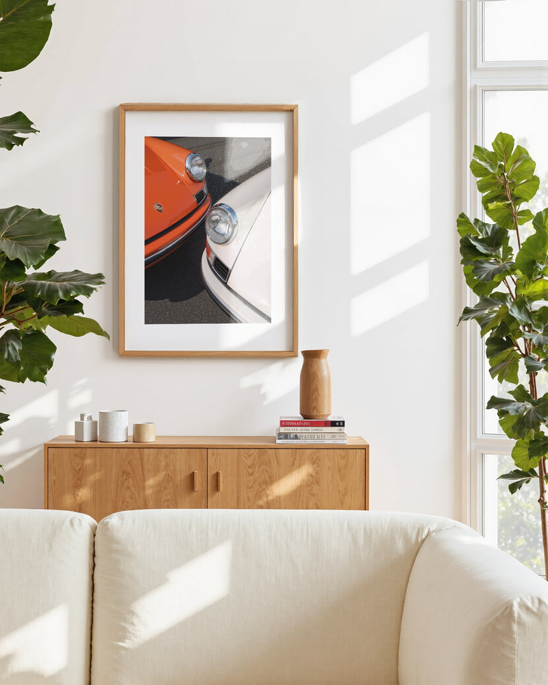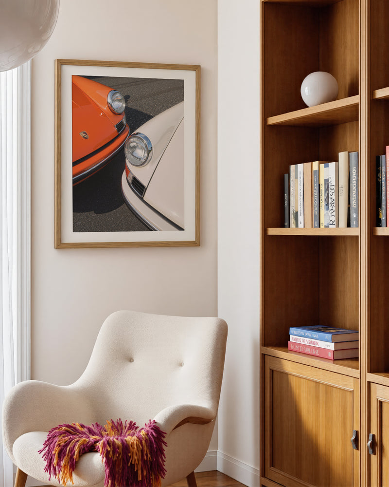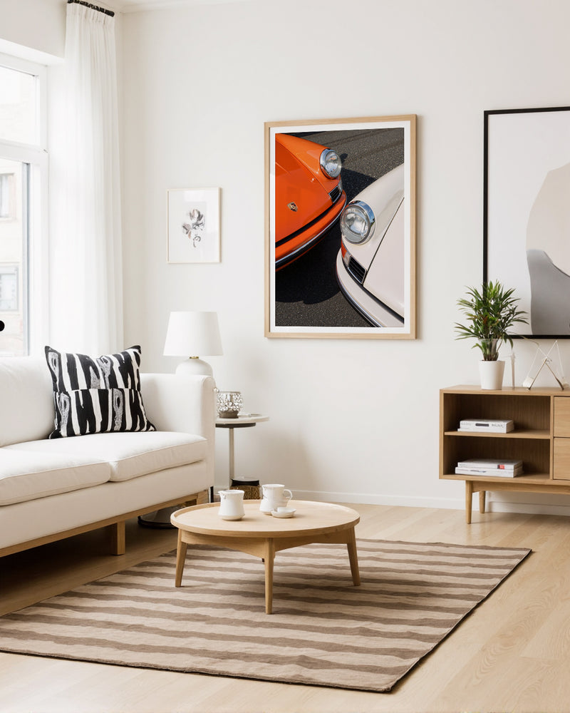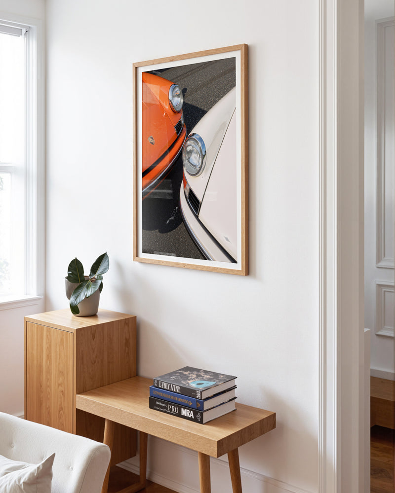 A masterful duet of automotive icons: two 1963 Porsche 911s captured in perfect symmetry. The interplay of orange and white creates a striking visual harmony, while the distinctive headlights and classic lines showcase the timeless design that revolutionized automotive history. This piece celebrates the birth year of a legend through a contemporary artistic lens.