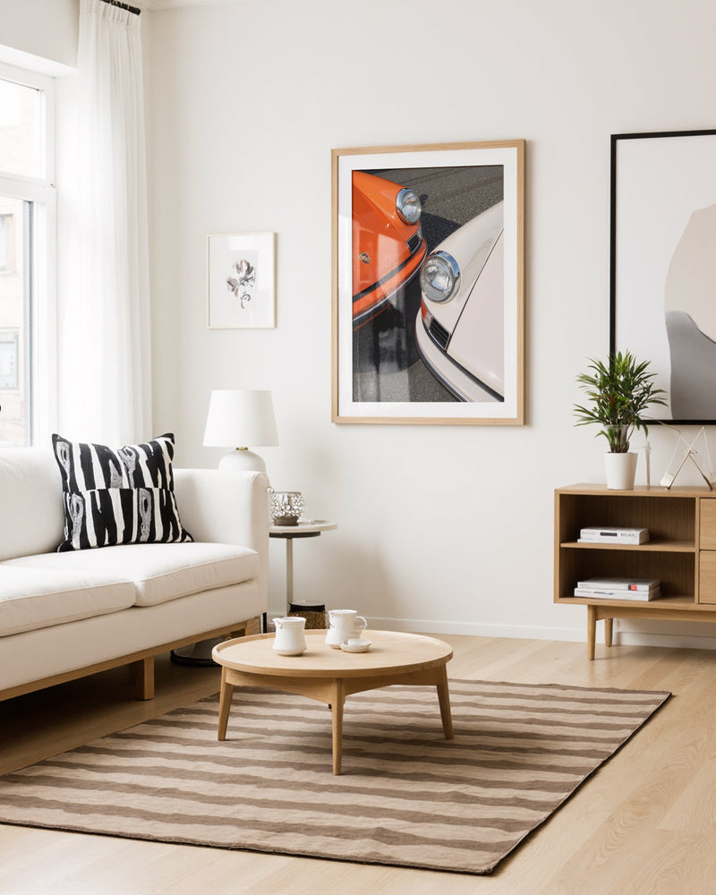 This piece resonates deeply with both automotive passion and artistic sophistication. The juxtaposition of the two legendary 1963 911s creates a powerful narrative about design, heritage, and timeless beauty. The contrasting colors serve not just as an artistic element but as a celebration of Porsche's enduring influence on automotive culture.