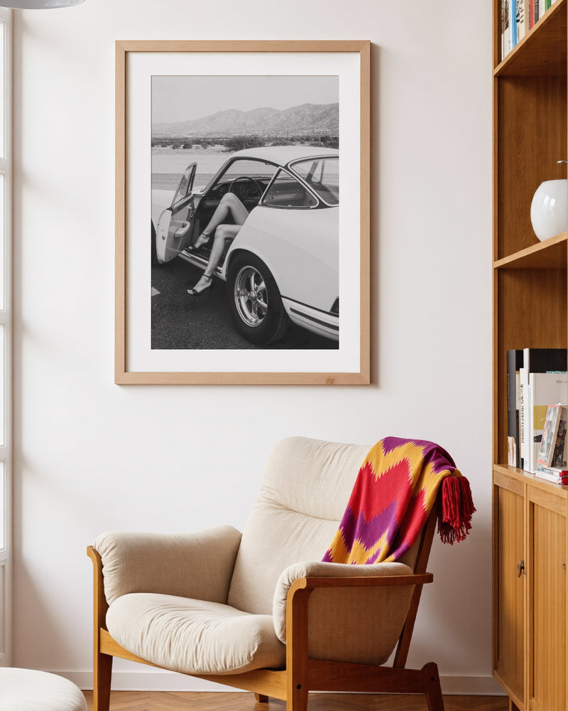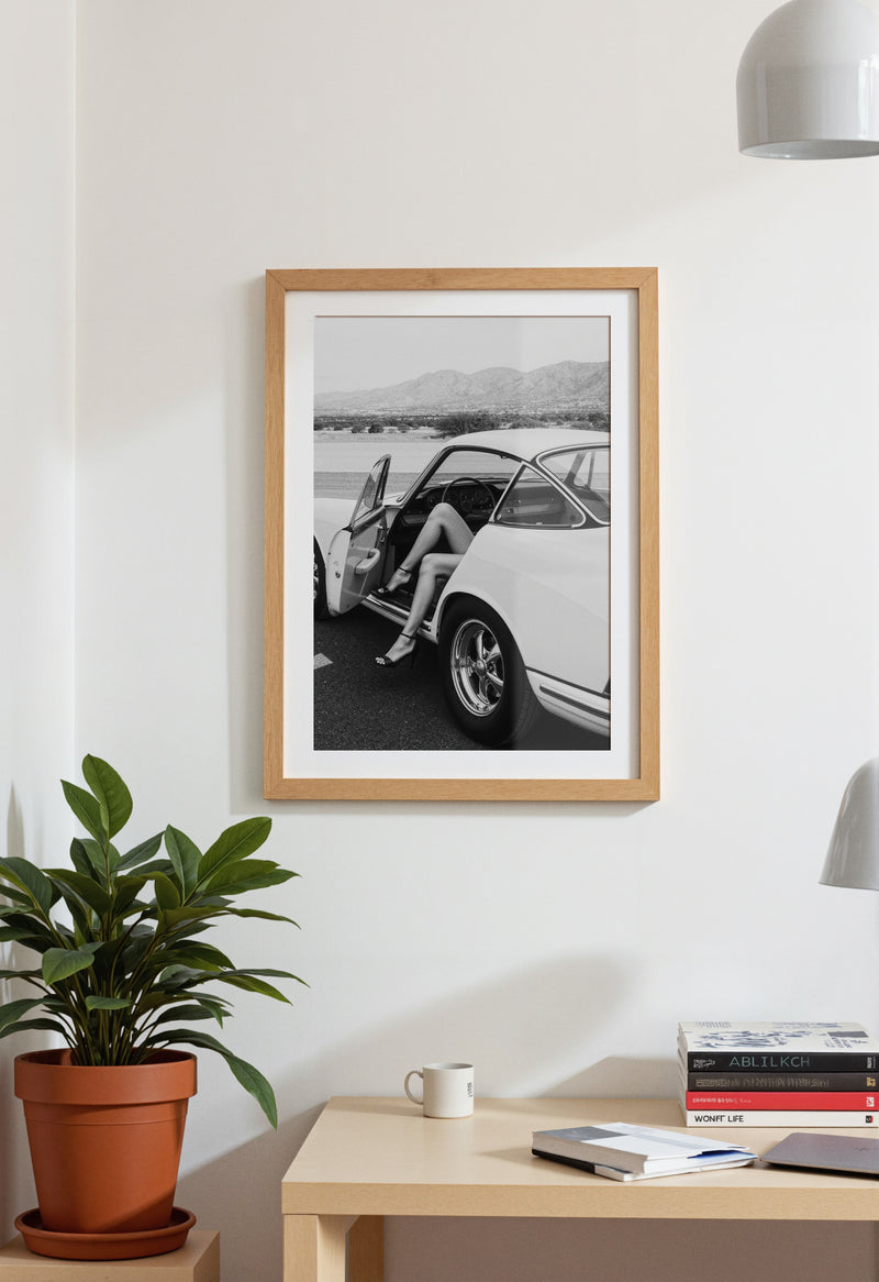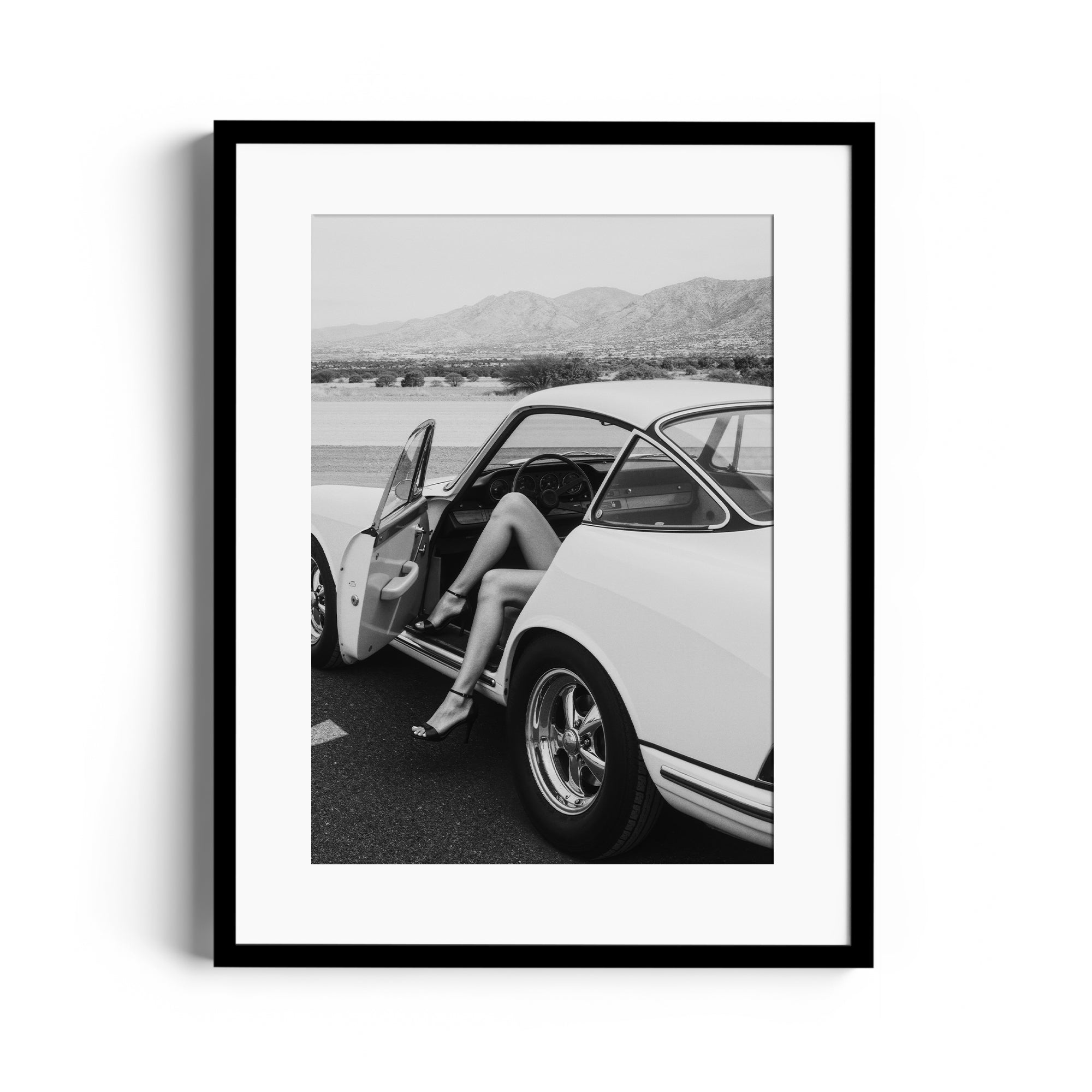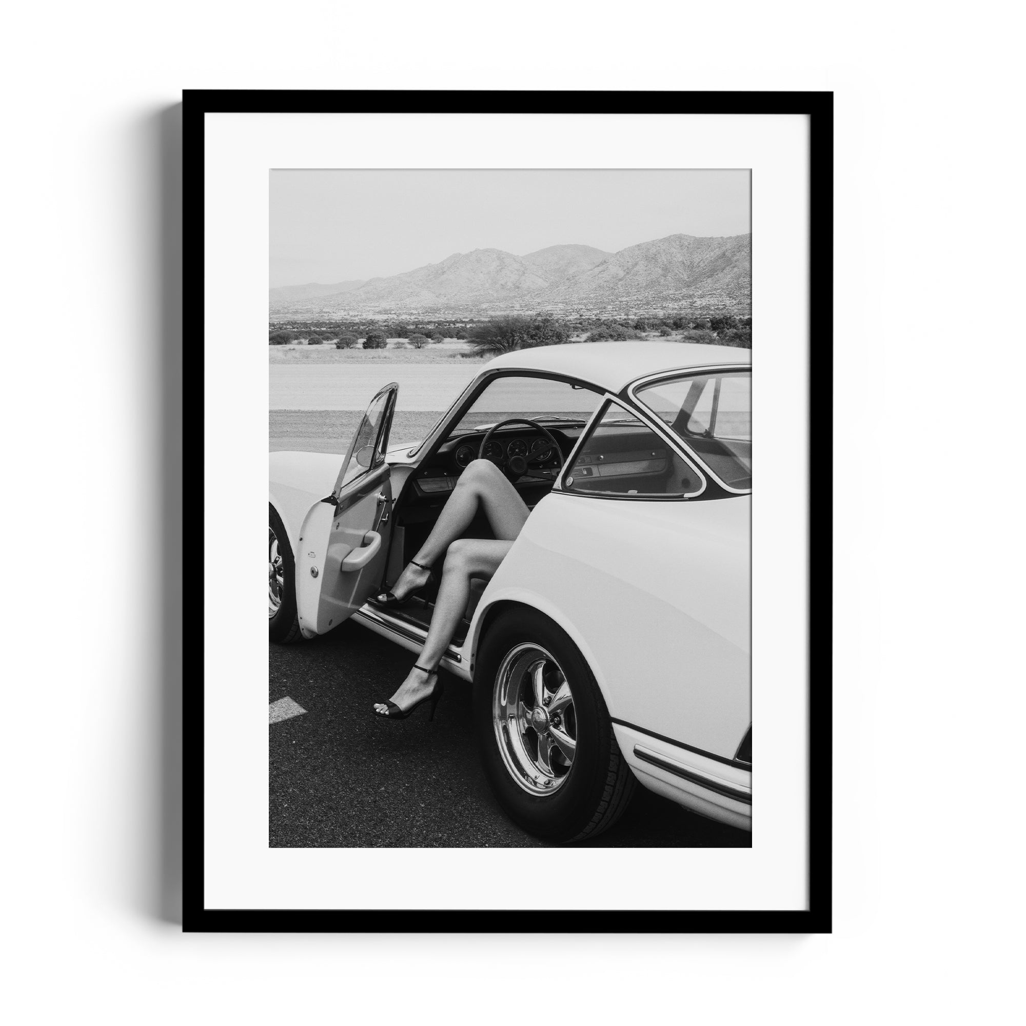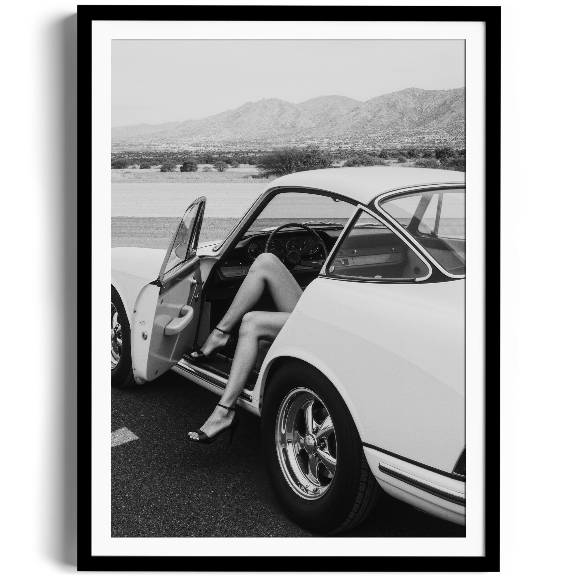 A masterful black-and-white composition where automotive heritage meets artistic sophistication. Featuring a classic Porsche 911, this piece creates a perfect harmony between mechanical elegance and human form, available in multiple sizes to suit any space.