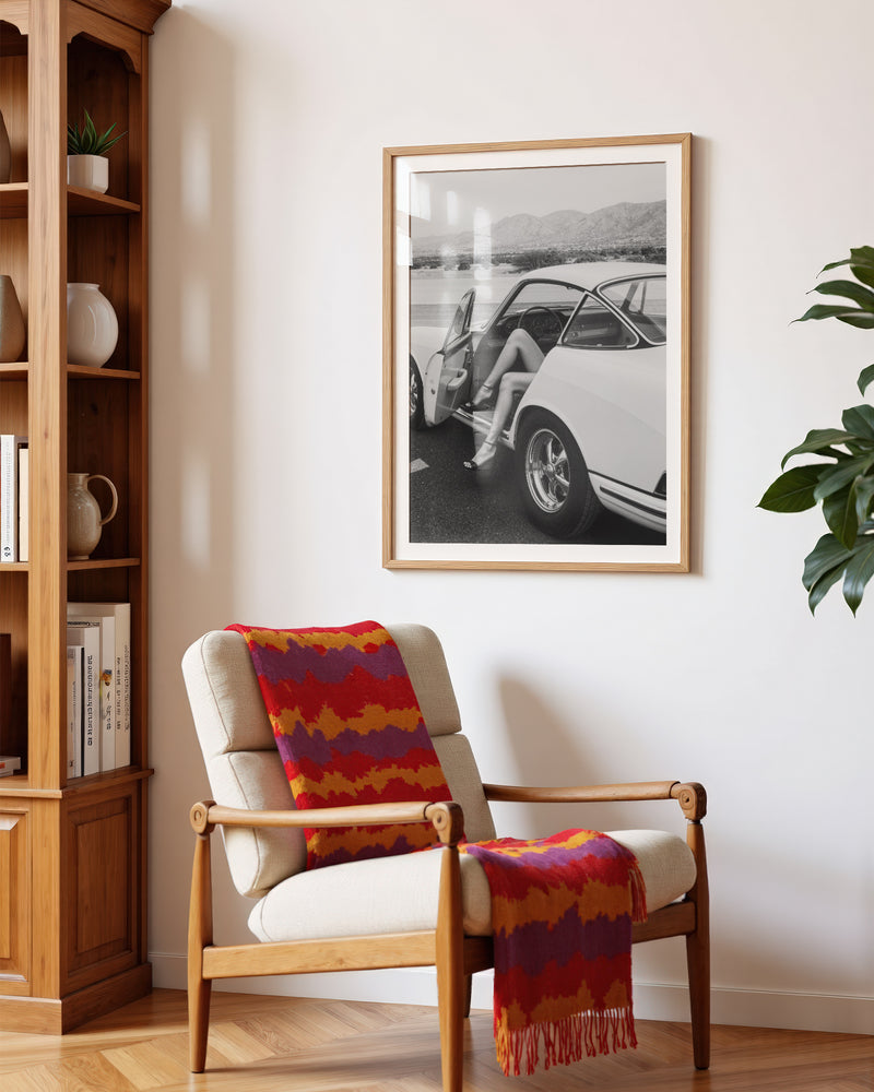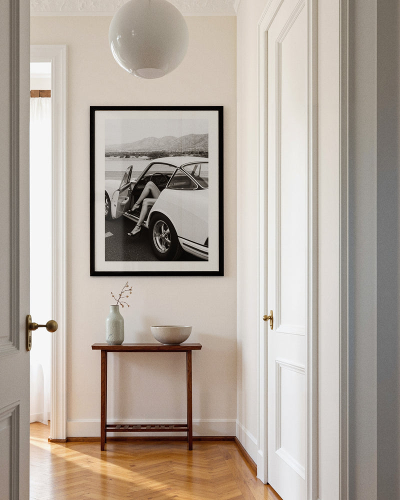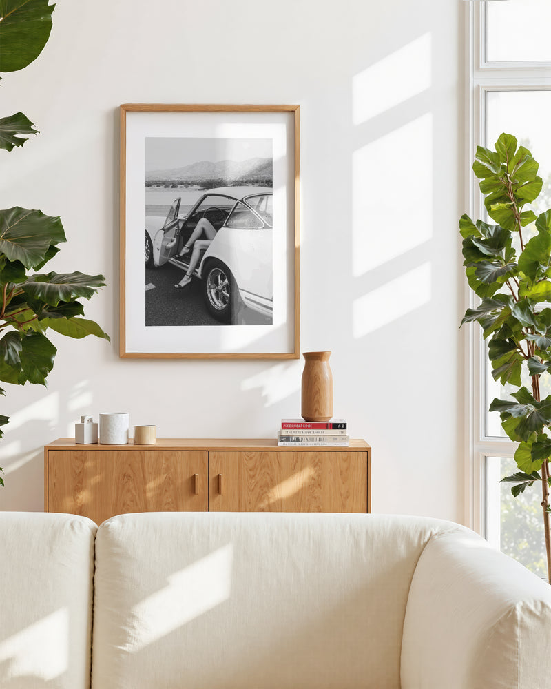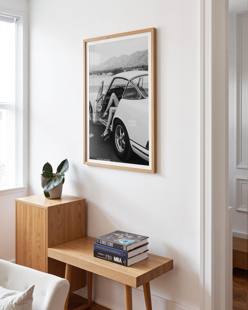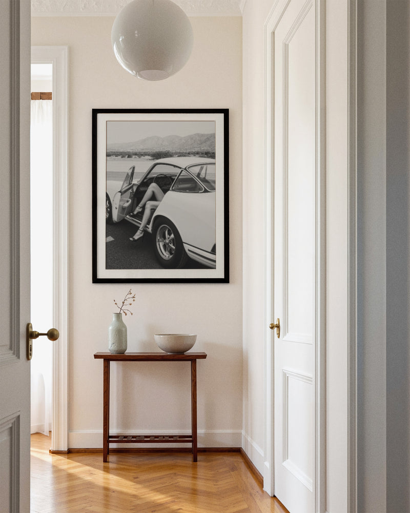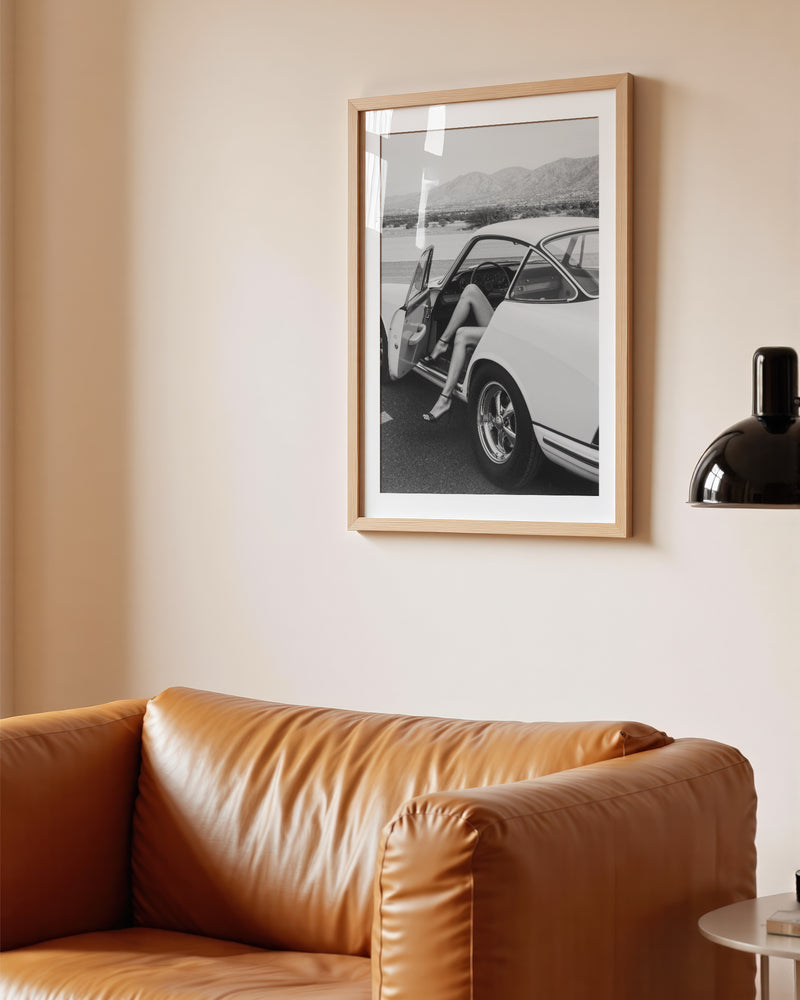 A masterful black-and-white composition where automotive heritage meets artistic sophistication. Featuring a classic Porsche 911, this piece creates a perfect harmony between mechanical elegance and human form, available in multiple sizes to suit any space.