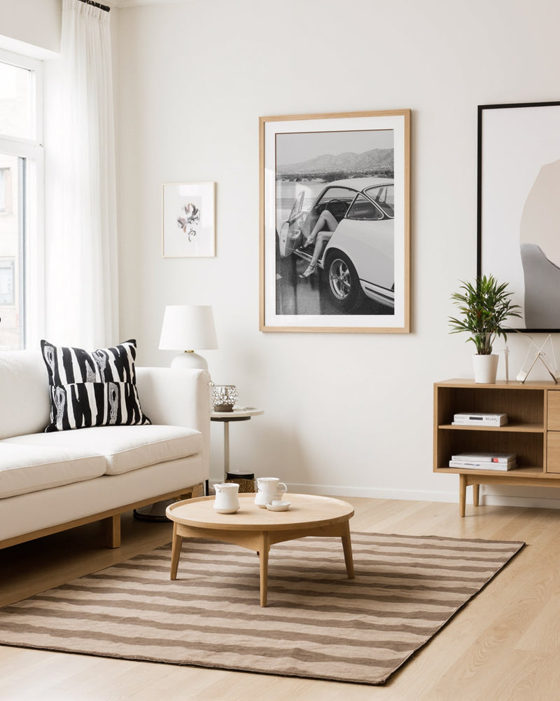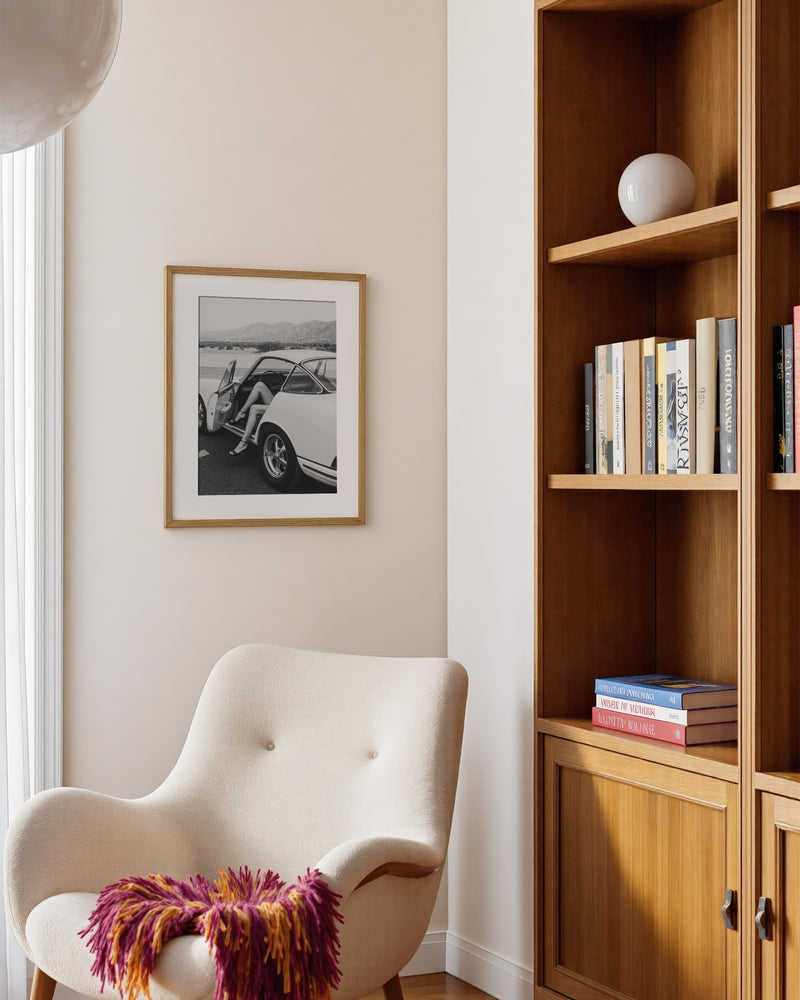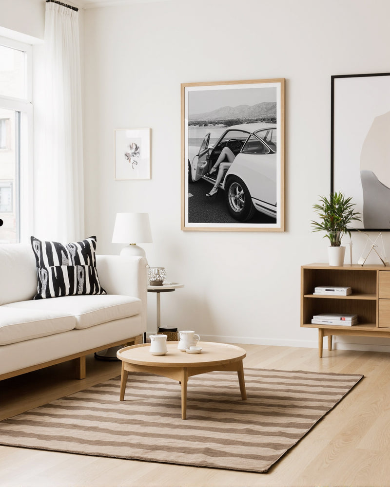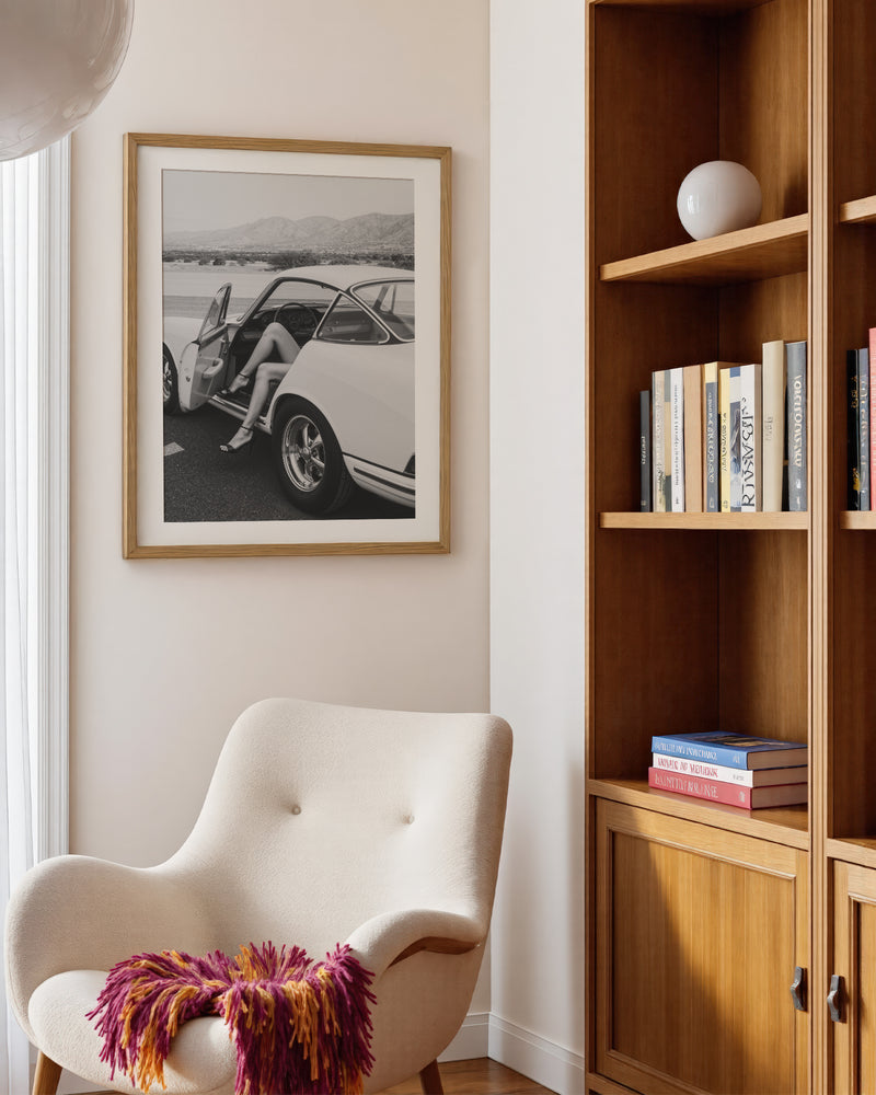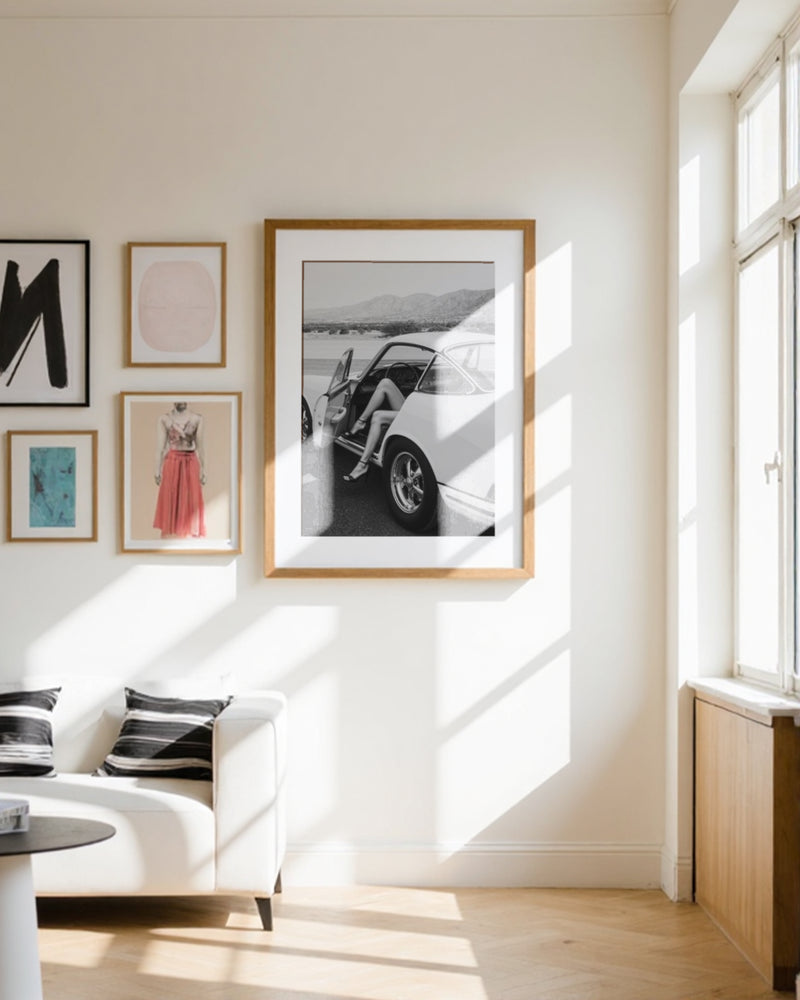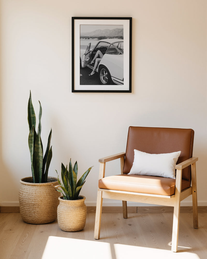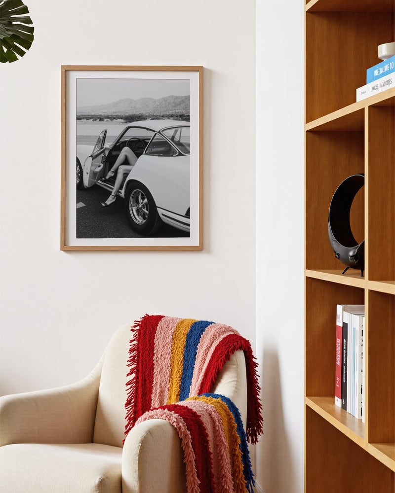 A masterful black-and-white composition where automotive heritage meets artistic sophistication. Featuring a classic Porsche 911, this piece creates a perfect harmony between mechanical elegance and human form, available in multiple sizes to suit any space.