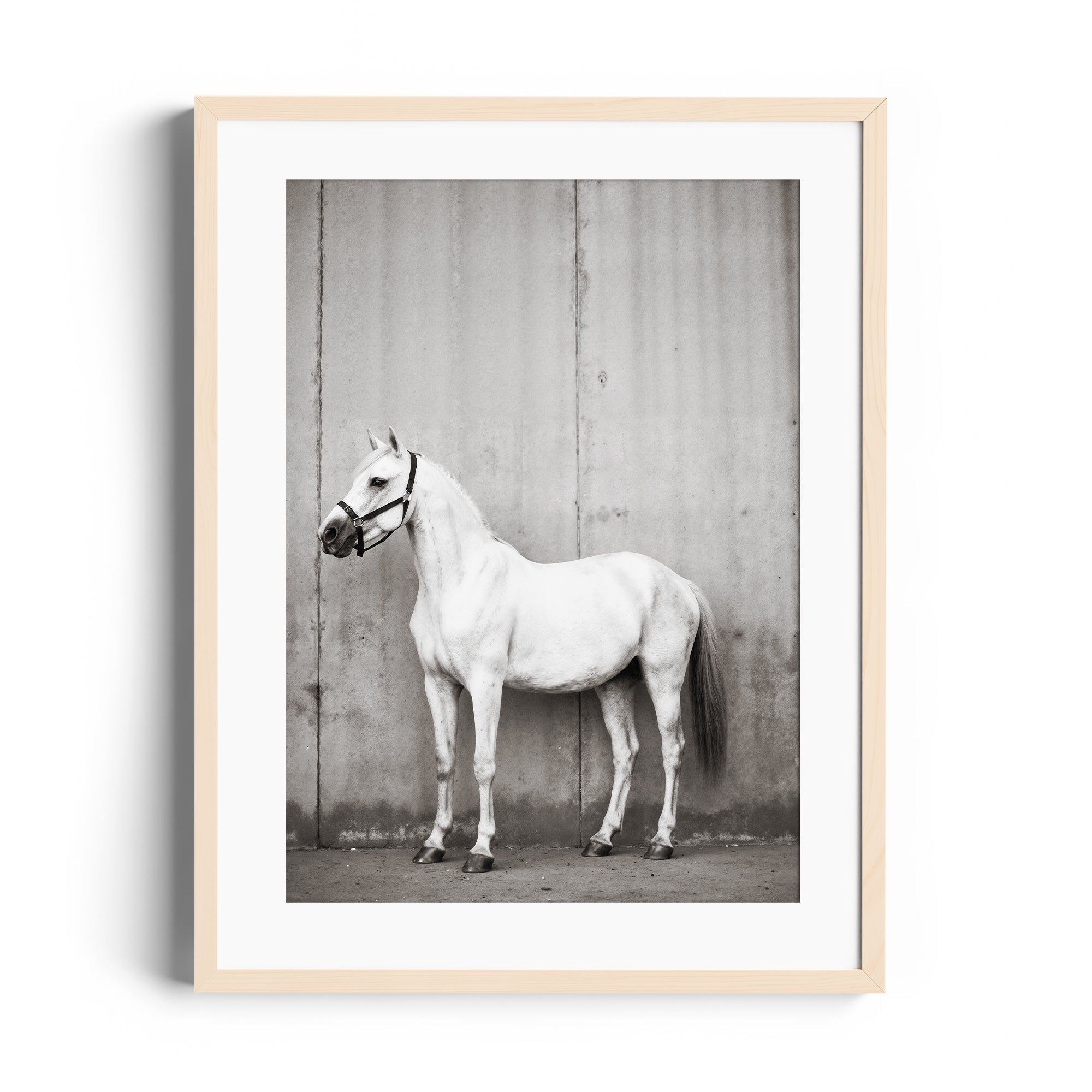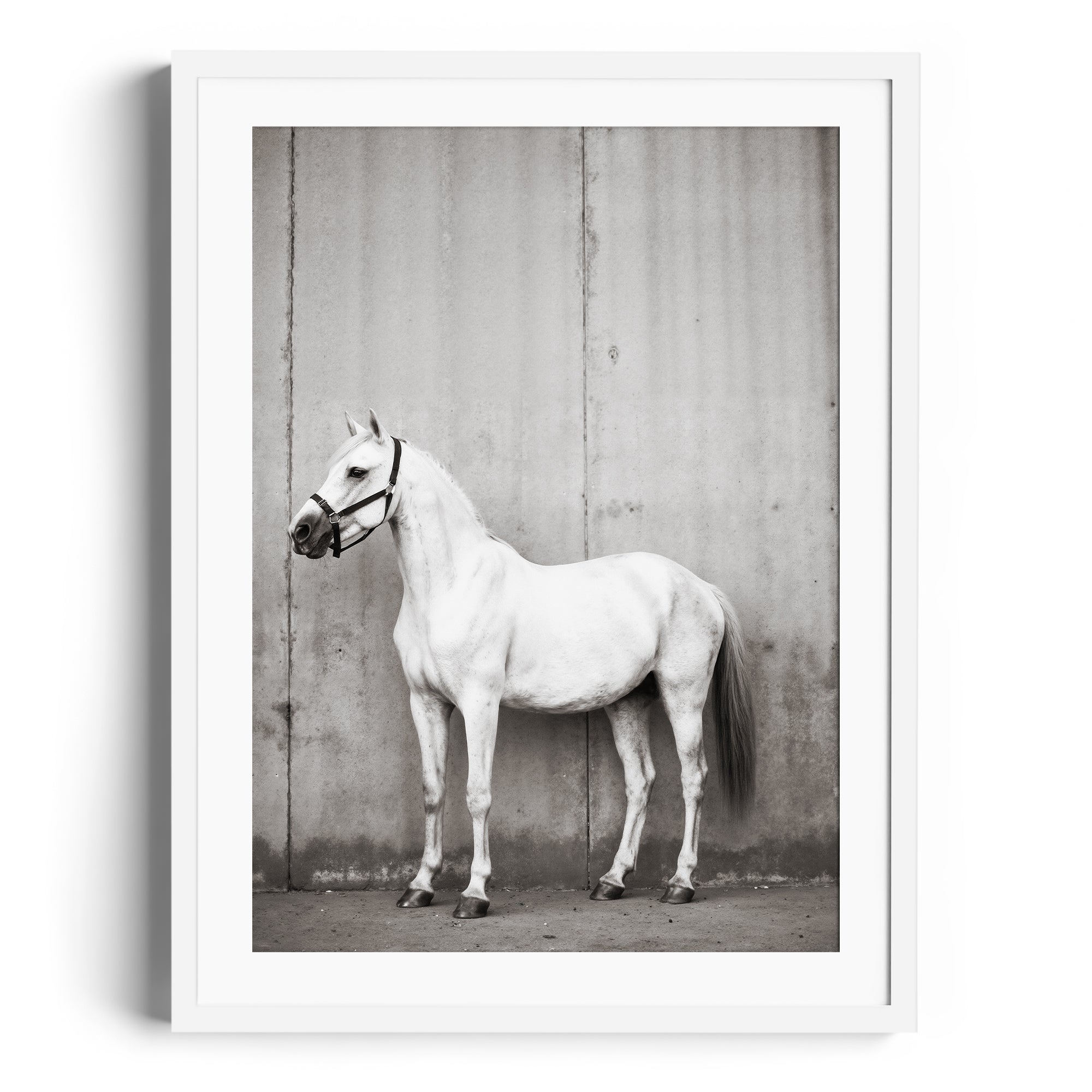 Through meticulous attention to detail and lighting control, the rich black leather of the saddle gains a sculptural presence over the horse's textured coat, enhancing its dramatic form.