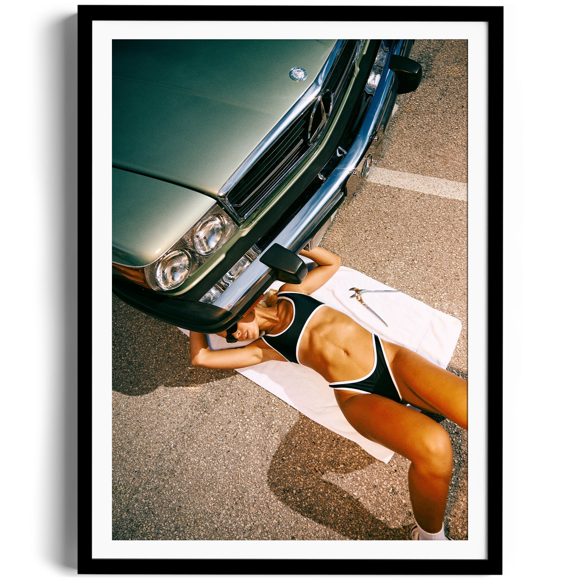 "Retro Drive" captures the effortless glamour of vintage automotive culture. A classic Mercedes becomes the backdrop for a sun-drenched moment of leisure, blending timeless luxury with bold sensuality. This piece is an ode to freedom, elegance, and the beauty of unhurried living.