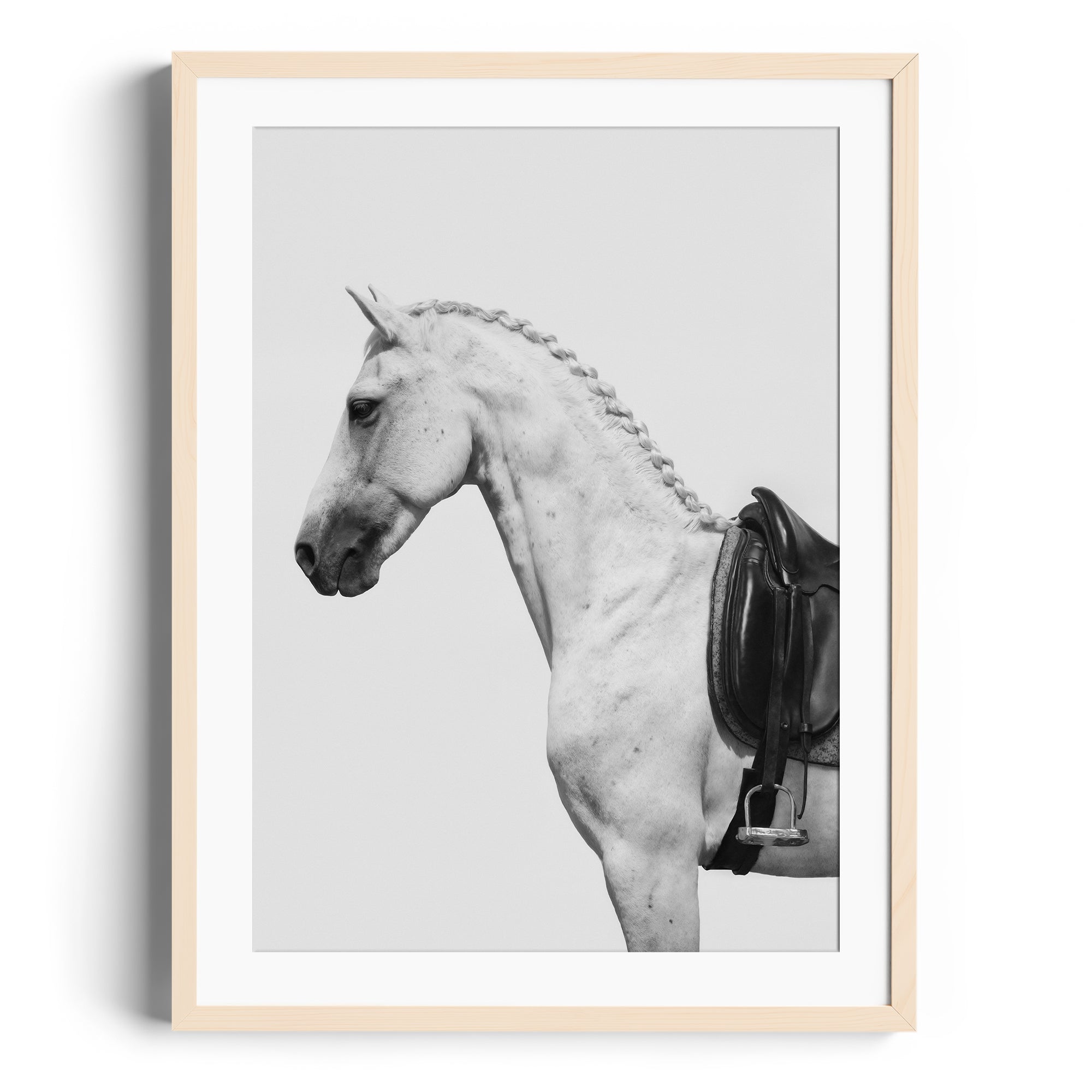 In this striking monochromatic composition, an exquisite English saddle rests on a dappled grey horse, highlighting contrast, texture, and equestrian elegance. Cadavid emphasizes the refined craftsmanship of traditional leatherwork, where every stitch and curve reflect precision and heritage.