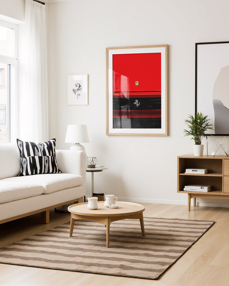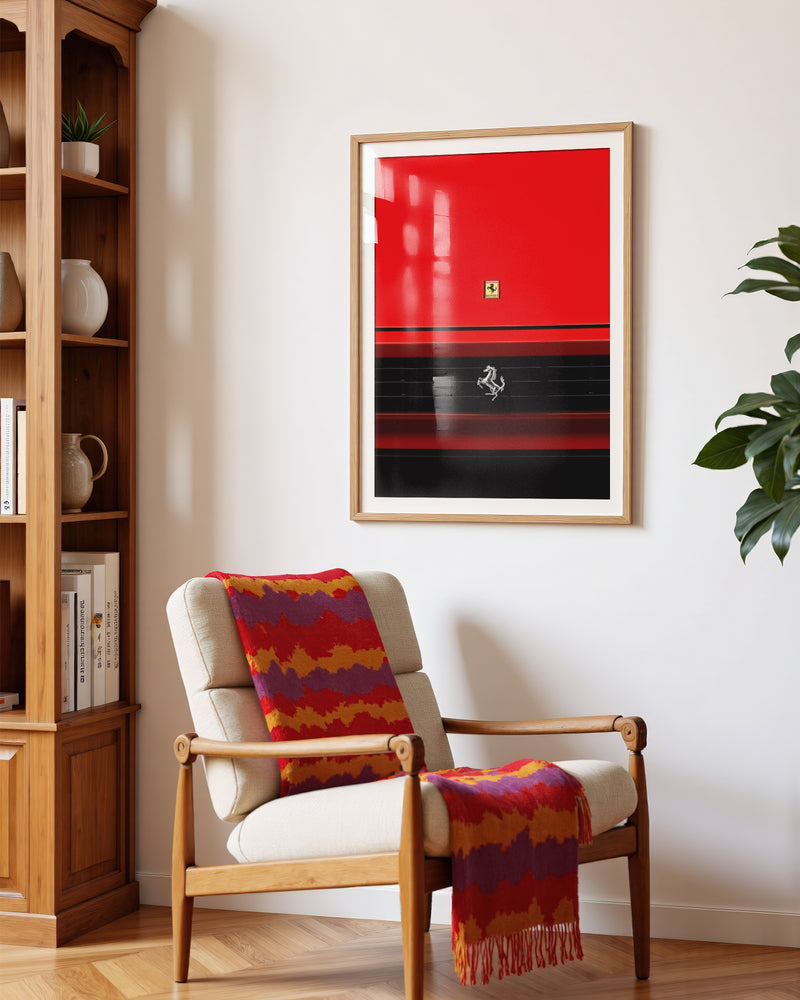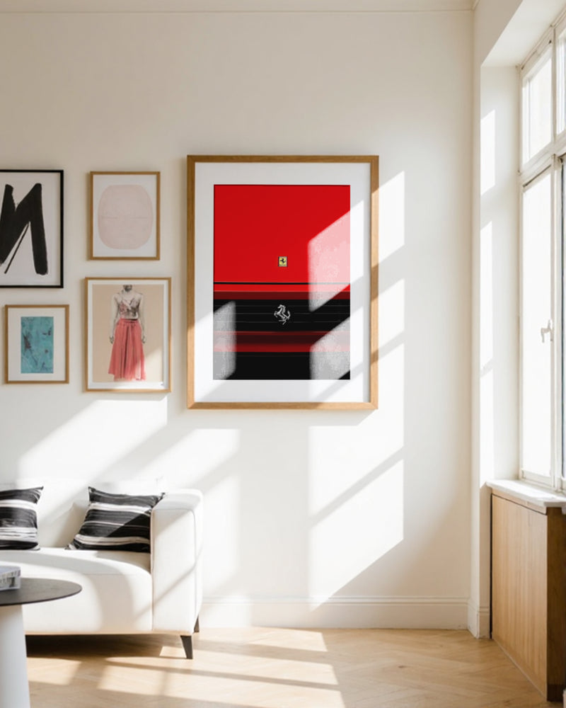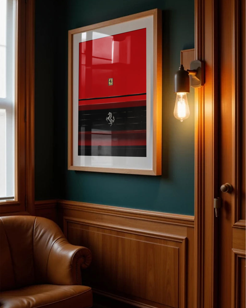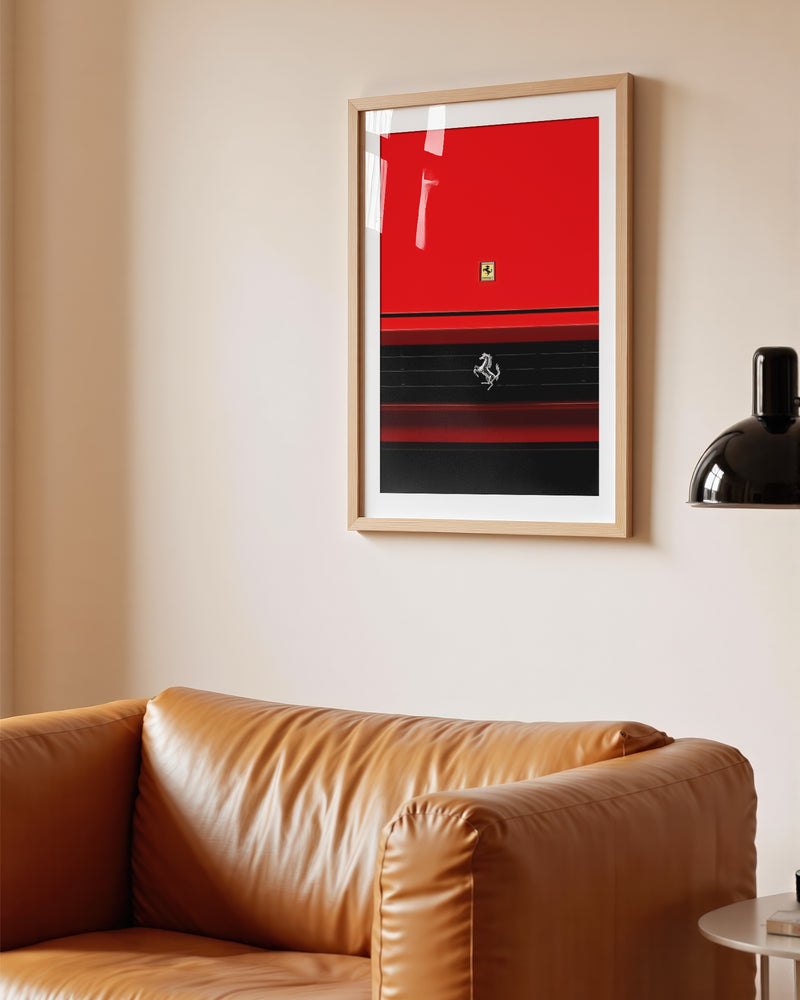 This piece elevates automotive photography to fine art, transforming the legendary Testarossa's front detail into a bold statement of Italian excellence. The minimalist approach highlights Ferrari's timeless design philosophy while creating a contemporary artwork that commands attention in any luxury space.