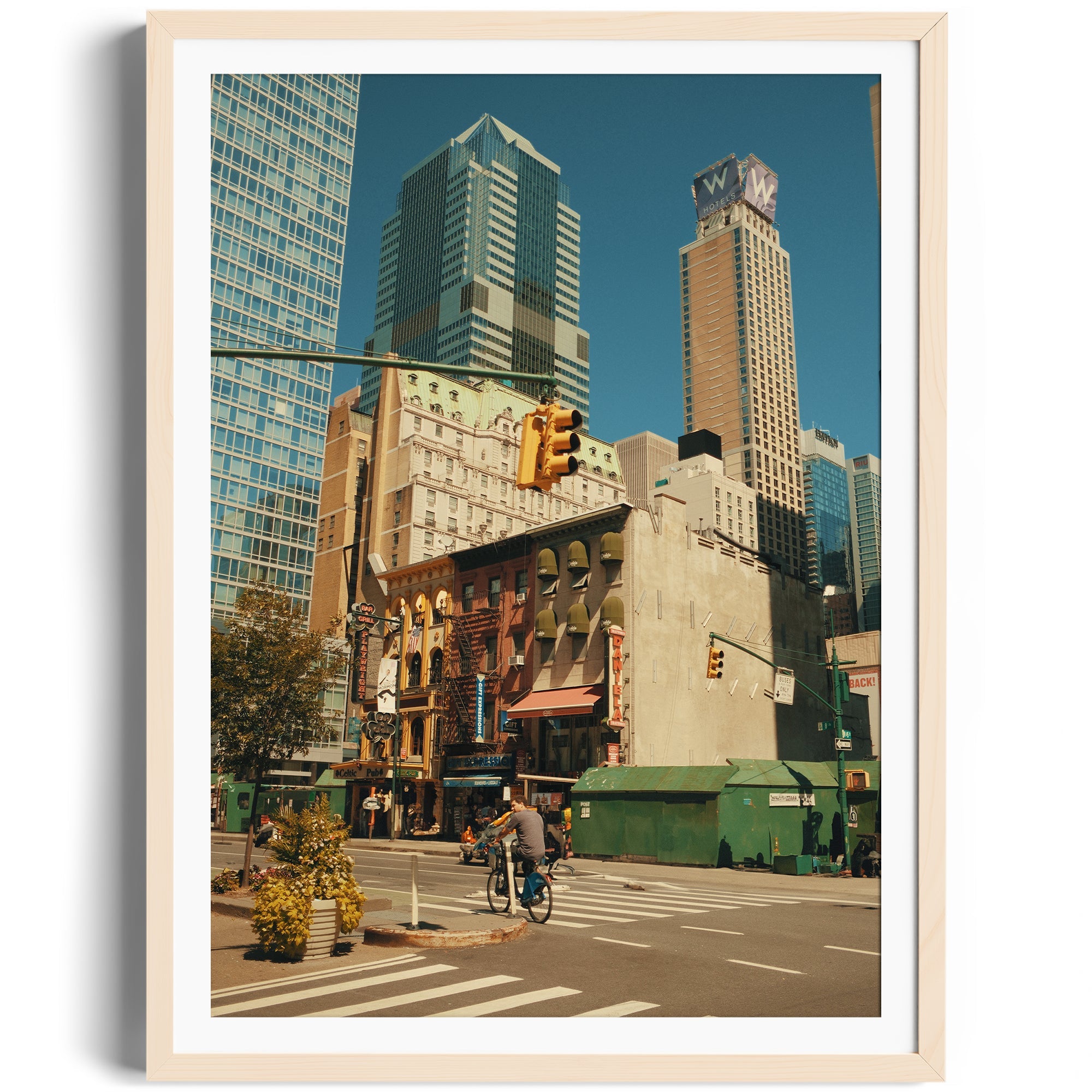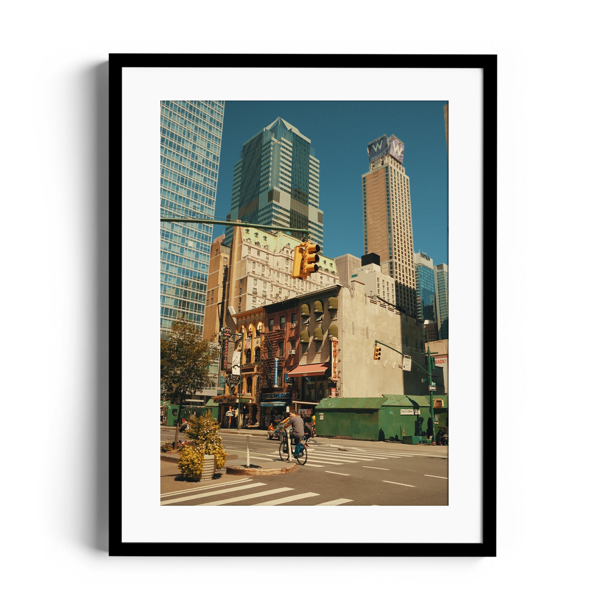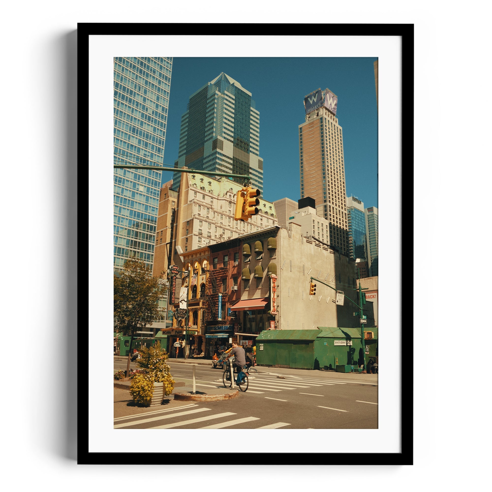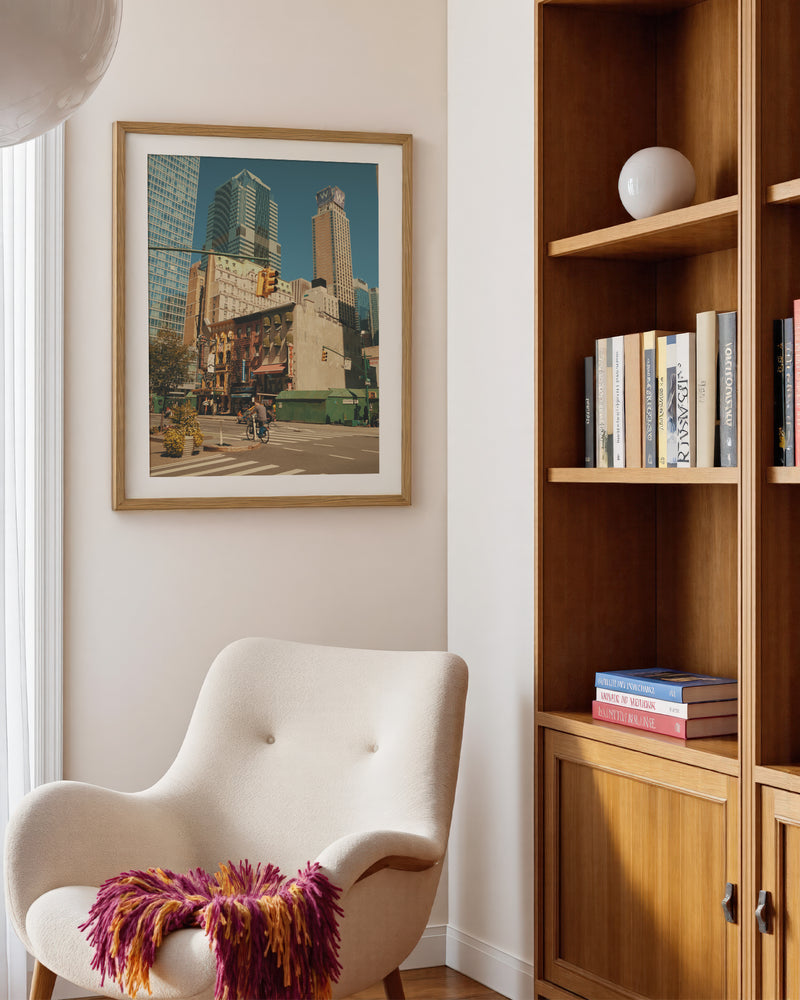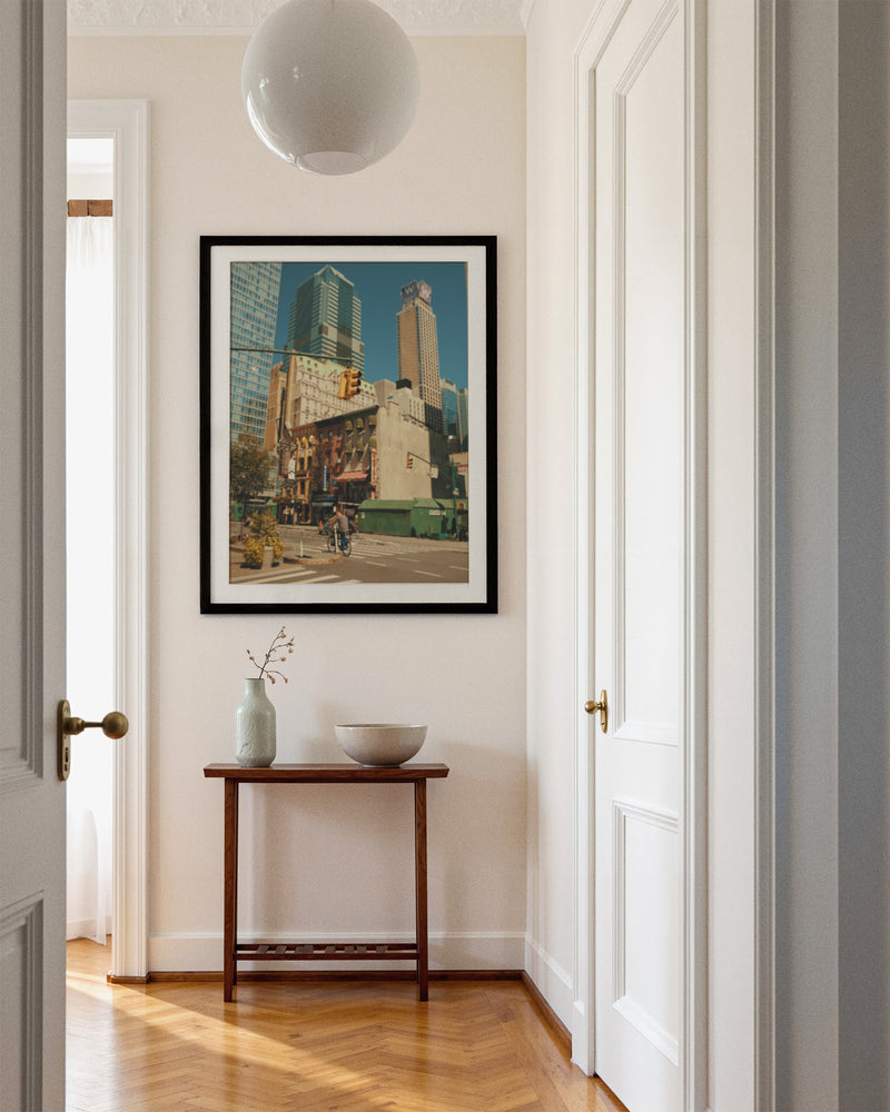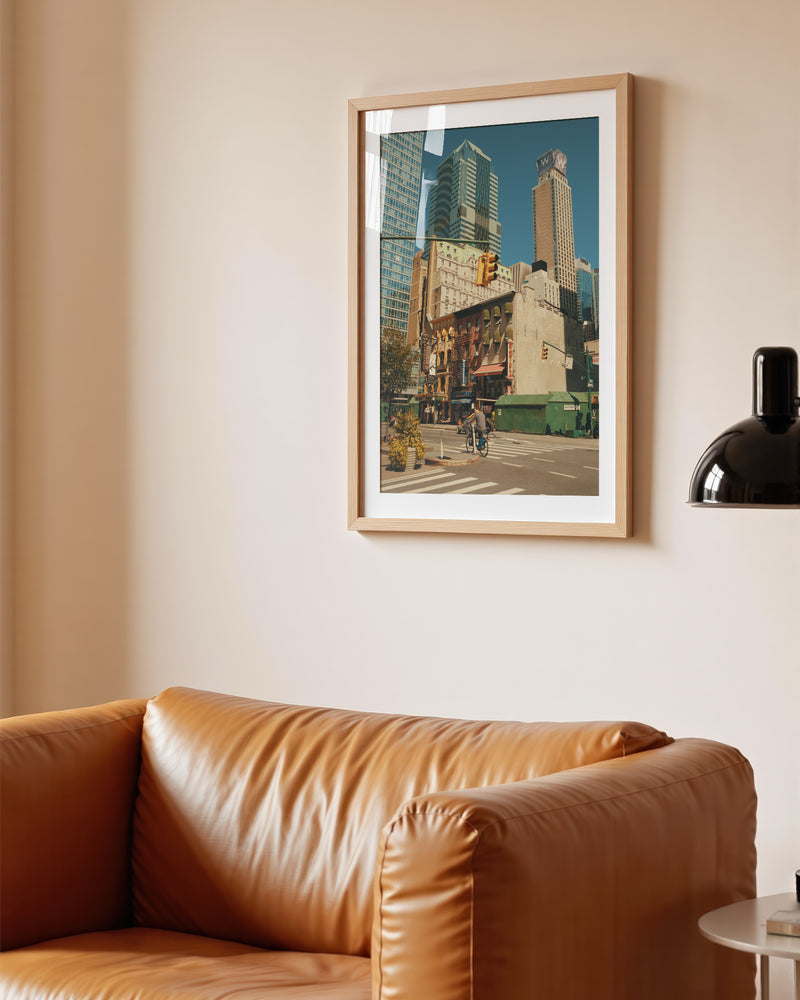 A cinematic slice of New York grandeur, where urban geometry meets street-level storytelling. In this masterful composition, a lone cyclist navigates the concrete canyons of Manhattan, dwarfed by towering skyscrapers that create a powerful study in scale and human perseverance. The perfect balance of architectural might and human spirit captures the essence of New York's perpetual motion.