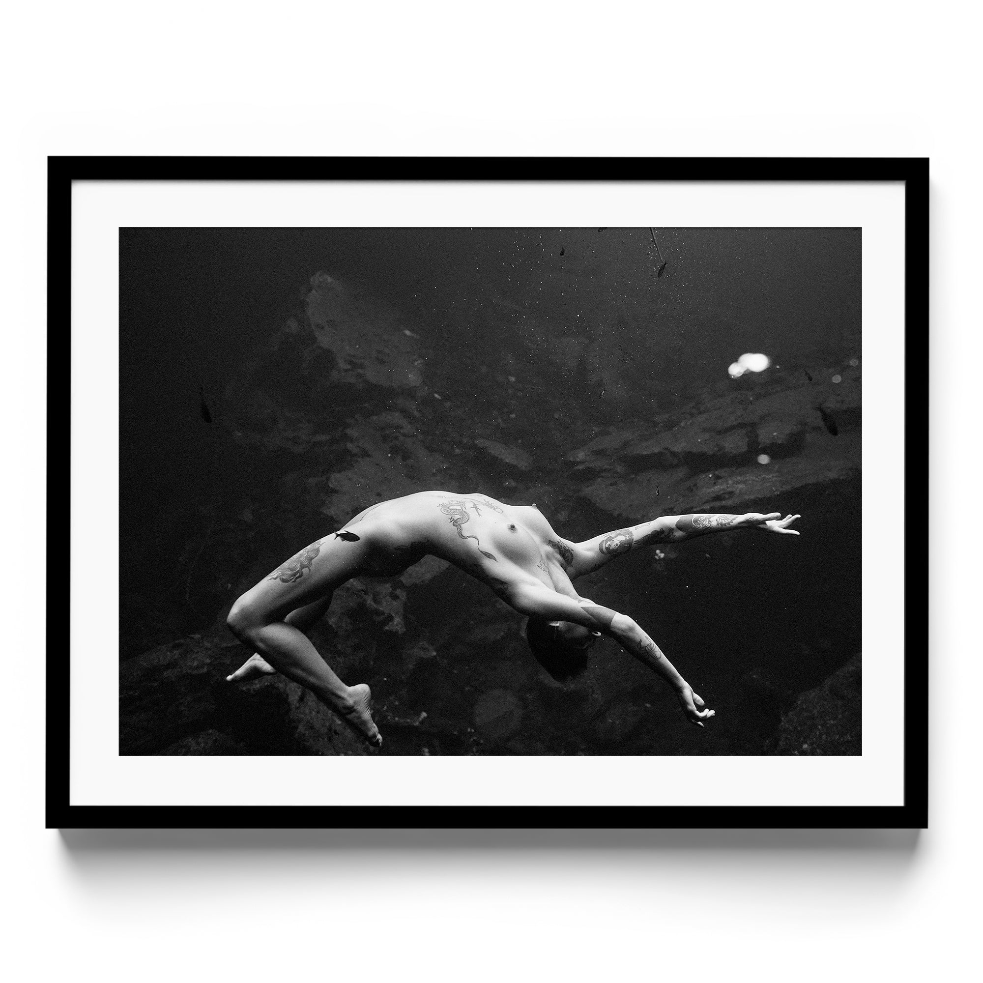 "Vita" is a powerful underwater composition that captures the elegance and freedom of movement. Photographed in the crystalline waters of Tulum, this piece celebrates the human form in harmony with nature, creating an image that is both serene and dynamic.